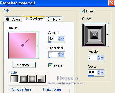 Cambia i settaggi del gradiente, selezionando Trama, e impostando la trama Griglia con i seguenti settaggi.