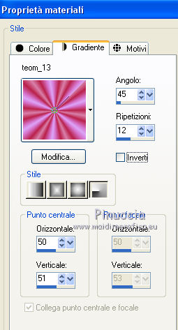 1. Passa il colore di primo piano a Gradiente, e seleziona il gradiente teom_13, con i seguenti settaggi: