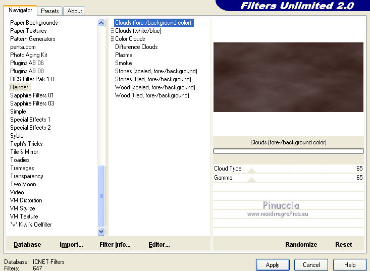 3. Effetti>Plugins>Filters Unlimited 2.0 - Render - Clouds (fore-/background color).