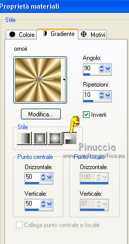 1. Passa il colore di primo piano a Gradiente e seleziona il gradiente "ornoir", con i seguenti settaggi.