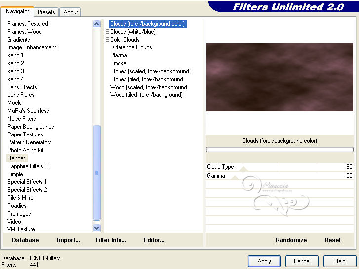 16. Effetti>Plugins>Filters Unlimited 2.0 - Render - Cloud (fore-/background color).