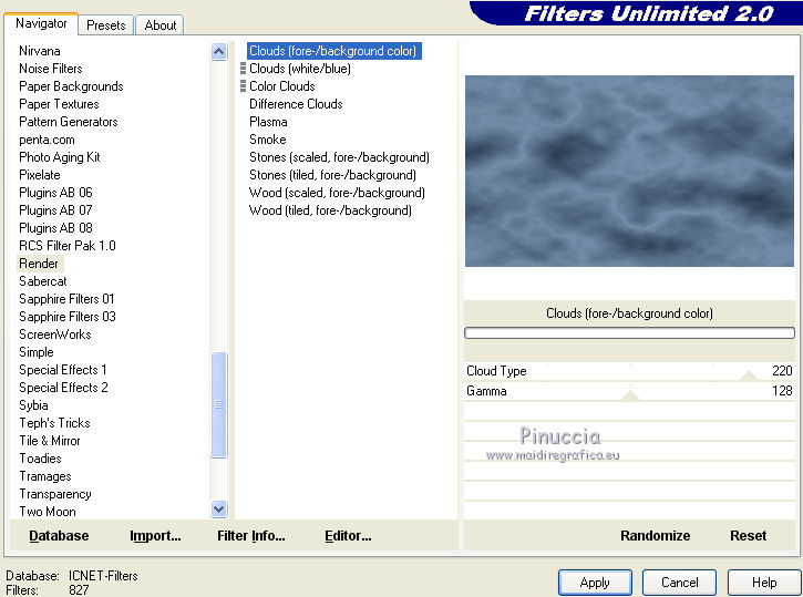 16. Effetti>Plugins>Filters Unlimited 2.0 - Render - Clouds (fore-/background colors).