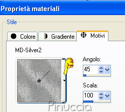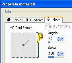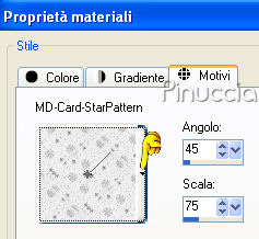 qui puoi trovare qualche risposta ai tuoi dubbi. Se l'argomento che ti interessa non è presente, ti prego di segnalarmelo. Questo tutorial può essere eseguito con tutte le versioni di PSP. Occorrente: Materiale qui Apri tutte le immagini dello zip in PSP. Apri il font e minimizzalo. Lo troverai nella lista dei font disponibili, quando ti servirà. Ricordati di salvare spesso. Apri una nuova immagine trasparente 400 x 300 pixels. Selezione>Seleziona tutto. Selezione>Modifica>Contrai, di 20 pixels. Imposta il colore di primo piano su Motivi e seleziona MD-Card-Pattern.jpg. ![]() Imposta il colore di sfondo su Motivi e seleziona MD-Silver2.jpg". ![]() Riempi la selezione con il motivo argento impostato come colore di sfondo.ricorda che per riempire con il colore di sfondo, devi cliccare con il tasto destro del mouse. Selezione>Modifica>Contrai, di 3 pixels. Riempi la selezione con il motivo di primo piano (MD-Card-Pattern).Selezione>Modifica>Contrai, di 50 pixels. Riempi con il motivo di sfondo (MD-Silver2).Selezione>modifica>Contrai, di 3 pixels. Riempi la selezione con il motivo di primo piano (MD-Card-Pattern.jpg).Selezione>Modifica>Contrai, di 15 pixels. Riempi la selezione con il motivo di sfondo (MD-Silver2).Selezione>Modifica>Contrai, di 3 pixels. Cambia il motivo impostato come colore di primo piano con MD-Card-StarPattern.jpg. ![]() Se decidi di eseguire il tutorial con i files forniti per la versione in oro, e vuoi seguire il mio esempio, per questo Motivo ho impostato la scala a 50). Riempi la selezione con il Motivo di primo piano.Selezione>Nessuna selezione. Se tutto è andato bene, dovresti avere questo. ![]() Sposta la cartolina in basso e a sinistra.![]() Attiva lo strumento Selezione a mano libera , da punto a punto,e seleziona un triangolo, come mostrato nella schermata sotto: ![]() Livelli>Nuovo livello raster. Nella paletta dei livelli sposta questo livello sotto il livello della cartolina. Riempi la selezione con il Motivo di sfondo (MD-Silver).Selezione>Nessuna selezione. Livelli>Unisci>Unisci visibile. Sposta la cartolina al centro della tela.Attiva lo strumento Testo , e seleziona il font Xmas Clipart2,dimensione 200, pennellata 0, allineamento centrale, antialias o Nitido. ![]() Di solito B per Bold è selezionato, ma per questo font è meglio non selezionarlo. Scrivi la lettera P maiuscola. Vi sono molte belle immagini in questo e nell'altro font fornito con il tutorial. Per questo esempio ho usato la P. Livelli>Converti in livello raster. Effetti>Effetti 3D>Sfalsa ombra, con i seguenti settaggi, colore nero. ![]() Sposta l'albero (o l'immagine che hai usato), al centro della cartolina.![]() Immagine>Dimensione tela, 450 x 400 pixels, e clicca sulla freccia al centro per distribuire lo spazio: ![]() Apri una nuova immagine trasparente 400 x 300 pixels. Selezione>Seleziona tutto. Selezione>Modifica>Contrai, di 20 pixels. Riempi con il motivo di sfondo (argento).Selezione>Modifica>Contrai, di 3 pixels. Riempi la selezione con il Motivo di primo piano (MD-Star-pattern.Selezione>Nessuna selezione. Apri Christmas-stamps.psp. Attiva lo strumento Selezione , rettangolo e seleziona uno dei francobolli.Modifica>Copia. Torna al tuo lavoro e vai a Modifica>Incolla>Incolla come nuovo livello. Sposta il francobollo nell'angolo in alto a destra.Livelli>Unisci>Unisci visibile. Modifica>Copia. Torna al tuo lavoro e vai a Modifica>Incolla>Incolla come nuovo livello. Immagine>Ruota>ruota per gradi - 20 gradi a sinistra. ![]() Nella paletta dei livelli sposta questo livello sotto il livello della cartolina. Sposta la busta in alto a sinistra (vedi l'esempio).Usa un bel font e aggiungi il tuo nome alla cartolina. Livelli>Unisci>Unisci visibile. Posiziona la cartolina su uno sfondo e salva in formato jpg. Se vuoi mantenere lo sfondo trasparente, puoi salvarla in formato gif. queste le impostazioni che ho usato io. Le ultime due cartoline sono state salvate in formato jpg. ![]() ![]() ![]() ![]() ![]() Se hai problemi o dubbi, o trovi un link non funzionante, o anche soltanto per un saluto, scrivimi. 20 Novembre 2007 |