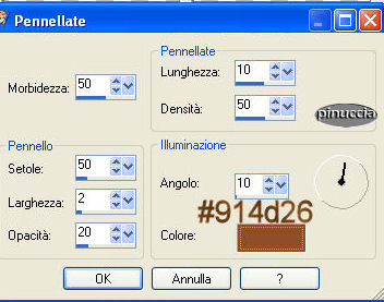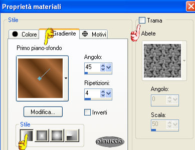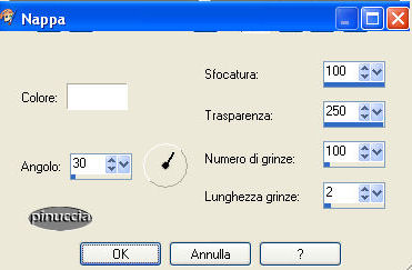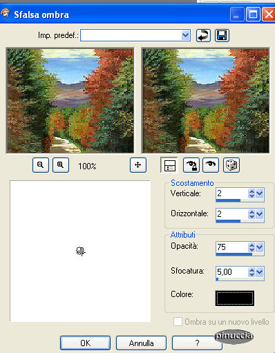 qui puoi trovare qualche risposta ai tuoi dubbi. Se l'argomento che ti interessa non è presente, ti prego di segnalarmelo. Occorrente: Materiale qui Ricordati di salvare spesso. Apri una delle 4 immagini autunnali contenute nello zip o usa una delle tue. Le immagini nello zip sono royalty free. Mar le ha acquistate da clipart.com. Shift+D per duplicarle. Metti da parte gli originali. Scegli due colori dalla tua immagine. Un colore chiaro per il primo piano e uno scuro per lo sfondo. Io ho usato come colore di primo piano #ae6e3e e #5c3411 come colore di sfondo. Passa il colore di primo piano a gradiente di primo piano/sfondo, trama non selezionato (manina rossa), con i seguenti settaggi: ![]() Immagine>Aggiungi bordatura, 5 pixels, simmetriche, con il colore giallo. Con la bacchetta magica (sfumatura 0, tolleranza 15)seleziona il bordo giallo. Riempi la selezione con il gradiente.Effetti>Effetti 3D>Smusso a incasso, colore bianco: ![]() Effetti>Effetti 3D>Sfalsa ombra, colore nero. ![]() Immagine>Aggiungi bordatura, 25 pixels, simmetriche, con il colore giallo. Seleziona il bordo giallo con la bacchetta magica ![]() Ritorna alla tua immagine originale e vai a Modifica>Copia. Torna alla tua cornice con il bordo giallo selezionato. Modifica>Incolla>Incolla nella selezione. Effetti>Effetti artistici>Pennellate, colore #914d26. ![]() ![]() Immagine>Aggiungi bordatura, 5 pixels, simmetriche, con il colore giallo. Seleziona il bordo giallo con la bacchetta magica ![]() Riempi la selezione con il gradiente.Effetti>Effetti 3D>Smusso a incasso, con i settaggi precedenti. Effetti>Effetti 3D>Sfalsa ombra, con i settaggi precedenti a 2 e a -2. Immagine>Aggiungi bordatura, 40 pixels, simmetriche, con il colore giallo. Seleziona il bordo giallo con la bacchetta magica ![]() Dovresti avere ancora nella memoria l'immagine originale. (Se non ce l'hai copiala nuovamente: Modifica>Copia). Modifica>Incolla>Incolla nella selezione. Ripeti Effetti>Effetti tecniche di disegno>Pennellate, con gli stessi settaggi. Effetti>Effetti di trama>Nappa, colore bianco. ![]() Regola>Morbidezza>Fuoco diffuso: ![]() ![]() Immagine>Aggiungi bordatura, 5 pixels, simmetriche, con il colore giallo. Seleziona il bordo giallo con la bacchetta magica ![]() Riempi il bordo con il gradiente.Adjust > Softness > Soft focus. Effetti>Effetti 3D>Smusso a incasso, con i settaggi precedenti. Effetti>Effetti 3D>Sfalsa ombra, con i settaggi precedenti a 2 e a -2. Apri MD-FallCorner1.psp e vai a Modifica>Copia. Torna al tuo lavoro e vai a Modifica>Incolla>Incolla come nuovo livello. Sposta la decorazione nell'angolo superiore sinistro.Effetti>Effetti 3D>Sfalsa ombra, con i settaggi precedenti, ma soltanto a 2. Apri MD-FallCorner2.psp e vai a Modifica>Copia. Torna al tuo lavoro e vai a Modifica>Incolla>Incolla come nuovo livello. Sposta la decorazione nell'angolo superiore destro.Effetti>Effetti 3D>Sfalsa ombra, con i settaggi precedenti, ma soltanto a 2. Apri MD-FallCorner3.psp e vai a Modifica>Copia. Torna al tuo lavoro e vai a Modifica>Incolla>Incolla come nuovo livello. Sposta la decorazione nell'angolo inferiore sinistro.Effetti>Effetti 3D>Sfalsa ombra, con i settaggi precedenti, ma soltanto a 2. Apri MD-FallCorner4.psp e vai a Modifica>Copia. Torna al tuo lavoro e vai a Modifica>Incolla>Incolla come nuovo livello. Sposta la decorazione nell'angolo inferiore destro.Effetti>Effetti 3D>Sfalsa ombra, con i settaggi precedenti, ma soltanto a 2. Nello zip ci sono molti altri angoli, hai una vasta scelta. Anche per la cornice blu. Così potrai creare la tua personale Fall Frame. Livelli>Unisci>Unisci tutto (appiattisci). ![]() ![]() ![]() ![]() Se hai problemi o dubbi, o trovi un link non funzionante, o anche soltanto per un saluto, scrivimi. Agosto 2006 |