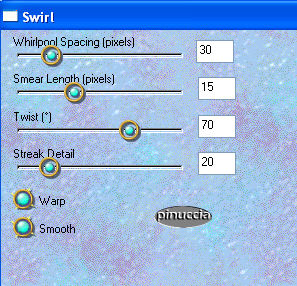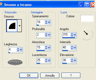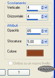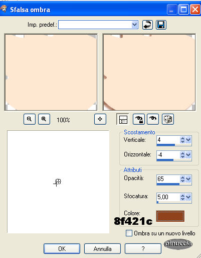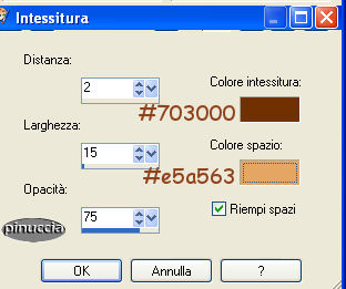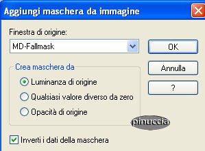 qui puoi trovare qualche risposta ai tuoi dubbi. Se l'argomento che ti interessa non è presente, ti prego di segnalarmelo. Occorrente: Materiale qui Eye Candy 3.1 qui Scompatta il filtro nella cartella plugins di PSP. Chiudi e riavvia PSP, altrimenti il filtro non funziona. Apri tutte le immagini dello zip in PSP. Apri il font e minimizzalo. Lo vedrai nella lista dei font disponibili attivando lo strumento Testo. Ricordati di salvare spesso. Apri una nuova immagine trasparente 400 x 400 pixels e riempila con il colore #ffcc99.Effetti>Plugins>Eye Candy 3.1 > Swirl. ![]() Applica. Apri una nuova immagine trasparente 250 x 200 pixels e riempila con il colore #ffe8d1.Apri MD-Fallmask.jpg. Livelli>Nuovo livello maschera>Da immagine. ![]() Cerca la maschera MD-Fallmask.jpg (inverti dati maschera selezionato) e clicca Applica. ![]() Livelli>Unisci>Unisci gruppo. Modifica>Copia e torna alla tua immagine 400x400. Modifica>Incolla>Incolla come nuovo livello. Sposta la foglia un po' in alto (vedi schermata).![]() Effetti>Effetti 3D>Sfalsa ombra, colore #8f421c. Attenzione il settaggio è verticale 4 e orizzontale -4. ![]() Selezione>seleziona tutto. Selezione>Mobile. Selezione>Immobilizza. (suona male ma è corretto così). Effetti>Effetti di deformazione>Spigato, colore #8f421c. ![]() Selezione>Nessuna selezione. Apri MD-InnerLeave.psp e vai a Modifica>Copia. Torna al tuo lavoro e vai a Modifica>Incolla>Incolla come nuovo livello. Sposta la foglia interna sopra la prima foglia.Nella paletta dei livelli abbassa l'opacità di questo livello al 40%. ![]() Livelli>Unisci>Unisci visibile. Apri uno dei funghi e vai a Modifica>Copia. Torna al tuo lavoro e vai a Modifica>Incolla>Incolla come nuovo livello. Apri il Porcospino e vai a Modifica>Copia. Torna al tuo lavoro e vai a Modifica>Incolla>Incolla come nuovo livello. Apri le due foglie (Leave 1 e 2) e vai a Modifica>Copia. Torna al tuo lavoro e vai a Modifica>Incolla>Incolla come nuovo livello. Usando i tubes, spostali e crea il tuo scenario. Questo è come appare il mio: ![]() Se sei soddisfatto, clicca sul livello di ogni tube che hai incollato e ripeti - un tube alla volta - l'Effetto Sfalsa ombra che hai usato per gli altri tubes. Chiudi il colore di primo piano e imposta il colore di sfondo con #8f421c. Attiva lo strumento Testo ![]() cerca il font Comic Sans Ms (è nello zip). Dimensione 36, pennellata 0, B per Bold, antialias selezionato o Nitido. Assicurati che l'allineamento sia impostato al centro. ![]() Scrivi Fall, o un altro testo autunnale o il tuo nome. Se hai un nome lungo, regola la dimensione del font. Clicca Applica. Livelli>Converti in livello raster. Effetti>Effetti 3D>Sfalsa ombra, con i settaggi precedenti. Livelli>Unisci>Unisci tutto (appiattisci). Immagine>Aggiungi bordatura, 5 pixels, simmetriche, con il colore #8f421c. Attiva la bacchetta magica (sfumatura 0)e seleziona il bordo marrone. Effetti>Effetti 3D>Smusso a incasso, colore bianco. ![]() Immagine>Aggiungi bordatura, 5 pixels, simmetriche, con il colore #ffe8d1. Seleziona il bordo con la bacchetta magica ![]() Effetti>Effetti 3D>Smusso a incasso, con i settaggi precedenti. Immagine>Aggiungi bordatura, 5 pixels, simmetriche, con il colore #8f421c. Seleziona il bordo marrone con la bacchetta magica ![]() Effetti>Effetti 3D>Smusso a incasso, con i settaggi precedenti. Selezione>Seleziona tutto. Selezione>Modifica>Contrai di 15 pixels. ![]() Selezione>Inverti. Effetti>Effetti di trama>Intessitura: Colori #703000 e #e5a563. ![]() Mantieni selezionato. Ripeti l'Effetto Sfalsa ombra ma questa volta Verticale e orizzontale a 4. ![]() Ripeti l'Effetto Sfalsa ombra ma cambiando verticale e orizzontale a -4. Selezione>Nessuna selezione. Apri MD- Chestnut.psp o MD-Rain.psp e vai a Modifica>Copia. Torna al tuo lavoro e vai a Modifica>Incolla>Incolla come nuovo livello. Posizionalo nell'angolo in alto a sinistra.Livelli>Unisci>Unisci tutto (appiattisci). ![]() ![]() ![]() Se hai problemi o dubbi, o trovi un link non funzionante, o anche soltanto per un saluto, scrivimi. Settembre 2006 |