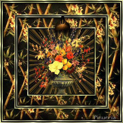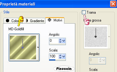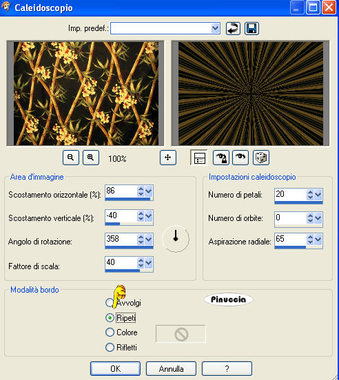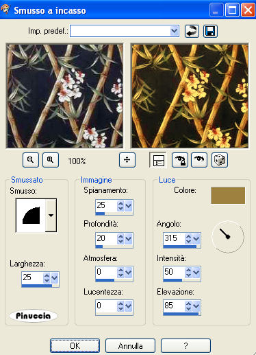 qui puoi trovare qualche risposta ai tuoi dubbi. Se l'argomento che ti interessa non è presente, ti prego di segnalarmelo. Questo tutorial è stato scritto e tradotto con PSP 9. Occorrente: Materiale: qui Apri tutte le immagini in PSP. Ricordati di salvare spesso. Puoi usare una gran quantità dei tuoi tubes per questo tutorial. Se vuoi adattare il colore del tube a quello della cornice, dovrai usare l'effetto Smusso a incasso, come vedrai più avanti nel tutorial. Attenzione... non tutti i tubes sono adatti. Prova prima l'effetto per controllare il risultato. Apri una nuova immagine trasparente 400 x 400 pixels. Passa il colore di primo piano a Motivi (pattern) e cerca MD-Goldfill.jpg, trame non selezionato (manina rossa). ![]() Imposta il colore di primo piano sul nero. Selezione>Seleziona tutto. ********* Questi passaggi tra gli asterischi saranno ripetuti ********* Riempi la selezione con il Motivo (pattern) oro.Selezione>Modifica>Contrai, 3 pixels. Livelli>Nuovo livello raster. Riempi la seleziona con il nero (clicca con il tasto destro del mouse).Selezione>Modifica>Contrai, 3 pixels. Riempi la selezione con il Motivo (pattern) oro.Selezione>Modifica>Contrai, 3 pixels. Livelli>Nuovo livello raster. Riempi la seleziona con il nero (clicca con il tasto destro del mouse).Selezione>Modifica>Contrai, 3 pixels. Mantieni la selezione attiva. ********* I passaggi da ripetere finiscono qui ********* Apri il file Gardenpattern.jpg e vai a Modifica>Copia. Torna alla tua cornice e vai a Modifica>Incolla>Incolla nella selezione. Effetti>Effetti 3D>Smusso a incasso, con i seguenti settaggi, colore #9e813e. Questa cornice può essere fatta in una infinità di colori. Proprio cambiando il colore dello smusso a incasso. In fondo al tutorial alcuni esempi con altri colori. ![]() Livelli>Unisci>Unisci tutto (appiattisci). La selezione è ancora attiva. Selezione>Modifica>Contrai di 35 pixels. Livelli>Nuovo livello raster. Ripeti i passaggi tra gli asterischi. Se tutto è stato fatto bene, dovresti avere questo: ![]() Dovresti avere ancora il Garden pattern in memoria. Se non è così.... aprilo e di nuovo vai a Modifica>Copia. Torna alla tua frame e vai a Modifica>Incolla>Incolla nella selezione. Effetti>Effetti 3D>Smusso a incasso, con i settaggi precedenti. La tua selezione è ancora attiva. Selezione>Modifica>Contrai, di 30 pixels. Livelli>Nuovo livello raster. Riempi la selezione con il Motivo oro.Selezione>Modifica>Contrai, di 3 pixels. Livelli>Nuovo livello raster. Riempi la selezione cliccando con il tasto destro del mouse (colore nero).Selezione>Modifica>Contrai, di 3 pixels. Hai ancora in memoria il file GardenPattern. Se non è così... aprilo di nuovo e vai a Modifica>Copia. Torna alla tua cornice e vai a Modifica>Incolla>Incolla nella selezione. Effetti>Effetti 3D>Smusso a incasso, con i settaggi precedenti. Effetti>Effetti di riflesso>Caleidoscopio: ![]() Applica. Selezione>Nessuna selezione. Livelli>Unisci>Unisci tutto (appiattisci). Scegli un tube dallo zip (o usa uno dei tuoi) e vai a Modifica>Copia. Torna alla tua cornice e vai a Modifica>Incolla>Incolla come nuovo livello. Sposta il tube del fiore al centro.Se usi un vaso... mettilo sul bordo dorato. Apri il file MD-Spotlight.psp e vai a Modifica>Copia. Torna al tuo lavoro e vai a Modifica>Incolla>Incolla come nuovo livello. Sposta il faro sulla prima o sulla seconda serie di bordi dorati: come ti sembra meglio. Livelli>Unisci>Unisci tutto (appiattisci). ![]() Il colore dello smusso a incasso di questa cornice è #ff9e63. ![]() Il colore dello smusso a incasso di questa cornice è #597334. ![]() Il colore dello smusso di questa cornice è #acb3cf; nella cornice di mezzo #9e813e. ![]() Se hai problemi o dubbi, o trovi un link non funzionante, o anche soltanto per un saluto, scrivimi. Luglio 2006 |