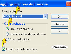 qui puoi trovare qualche risposta ai tuoi dubbi. Se l'argomento che ti interessa non è presente, ti prego di segnalarmelo. Occorrente: Materiale: qui Apri tutte le immagini in PSP. Apri il font e minimizzalo. Lo avrai immediatamente a disposizione del tuo strumento Testo. Ricordati di salvare spesso Apri una nuova immagine trasparente 400 x 400 pixels e riempila con il nero.Apri il file MD-Gothicmsk-1.jpg (nello zip). Apri una nuova immagine trasparente 300 x 250 pixels e riempila con #770000.Livelli>Nuovo livello maschera>Da immagine. ![]() Cerca MD-Gothicmsk1.jpg e applica. Inverti i dati della maschera selezionato. ![]() Livelli>Unisci>Unisci gruppo. Modifica>Copia. Ritorna alla tua immagine nera (400x400). Modifica>Incolla>Incolla come nuovo livello. Sposta questo livello in alto a destra, contro il bordo.![]() (un consiglio: per vedere meglio dove posizioni la maschera puoi momentaneamente abbassare l'opacità del livello di sfondo. NON DIMENTICARE di riportare l'opacità a 100) Adesso ritorna alla tua maschera. Immagine>Rifletti. Apri una nuova immagine trasparente 250 x 200 pixels e riempila con il nero.Livelli>Nuovo livello maschera>Da immagine. Cerca nuovamente MD-Gothicmsk-1.jpg e applica. Livelli>Unisci>Unisci gruppo. Modifica>Copia. Ritorna alla tua immagine nera (400x400). Modifica>Incolla>Incolla come nuovo livello. Sposta anche questo livello in alto a destra contro il bordo.![]() Livelli>Unisci>Unisci tutto (appiattisci). Apri una nuova immagine trasparente 400 x 60 pixels e riempila con #770000. Apri MD-Gothicmsk-2.jpg (nello zip). Livelli>Nuovo livello maschera>Da immagine. Cerca nuovamente MD-Gothicmsk-2.jpg e applica. Livelli>Unisci>Unisci gruppo. Modifica>Copia. Ritorna all tua immagine nera (400x400). Modifica>Incolla>Incolla come nuovo livello. Sposta questo livello in basso.![]() Apri una nuova immagine trasparente 215 x 25 pixels e riempila con #770000.Apri MD-Gothicmsk-3.jpg (nello zip). Livelli>Nuovo livello maschera>Da immagine. Cerca nuovamente MD-Gothicmsk-3.jpg e applica. Livelli>Unisci>Unisci gruppo. Modifica>Copia. Ritorna all tua immagine nera (400x400). Modifica>Incolla>Incolla come nuovo livello. Ripeti Modifica>Incolla>Incolla come nuovo livello. Sposta i livelli come si vede in schermata:![]() Apri una nuova immagine trasparente 95 x 160 pixels e riempila con #770000.Apri MD-Gothicmsk-4.jpg (nello zip). Livelli>Nuovo livello maschera>Da immagine. Cerca nuovamente MD-Gothicmsk-4.jpg e applica. Livelli>Unisci>Unisci gruppo. Modifica>Copia. Ritorna all tua immagine nera (400x400). Modifica>Incolla>Incolla come nuovo livello. Ripeti Modifica>Incolla>Incolla come nuovo livello. Sposta questo livello come si vede in schermata:![]() Apri una nuova immagine trasparente 285 x 125 pixels e riempila con #770000.Apri MD-Gothicmsk-5.jpg (nello zip). Livelli>Nuovo livello maschera>Da immagine. Cerca nuovamente MD-Gothicmsk-5.jpg e applica. Livelli>Unisci>Unisci gruppo. Modifica>Copia. Ritorna all tua immagine nera (400x400). Modifica>Incolla>Incolla come nuovo livello. Ripeti Modifica>Incolla>Incolla come nuovo livello. Sposta questo livello sopra le due strisce che hai aggiunto prima.![]() Apri MD-Gothic-Rose.psp e vai a Modifica>Copia. Torna al tuo lavoro e vai a Modifica>Incolla>Incolla come nuovo livello. Sposta il livello della rosa sotto il livello della striscia superiore.![]() Livelli>Unisci>Unisci tutto (appiattisci). Apri uno dei bellissimi tubes di Silke. Modifica>Copia. Torna al tuo lavoro e vai a Modifica>Incolla>Incolla come nuovo livello. Muovi il tube dove preferisci