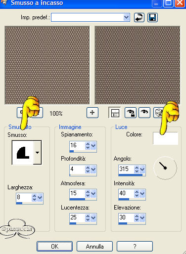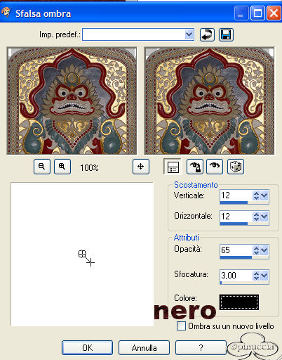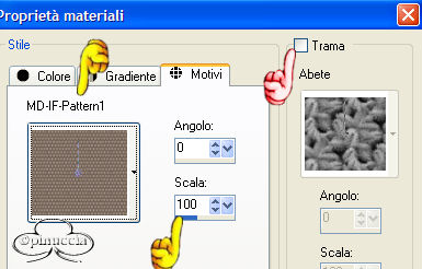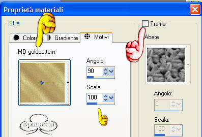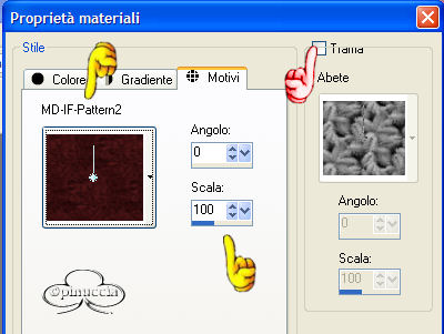 qui puoi trovare qualche risposta ai tuoi dubbi. Se l'argomento che ti interessa non è presente, ti prego di segnalarmelo. Questo tutorial è stato scritto e tradotto con PSP 9. Occorrente: Materiale: qui Apri tutte le immagini in PSP. Ricordati di salvare spesso. Il tutorial è stato fatto in PSP 9. I tubes nello zip sono stati fatti da Mar, utilizzando delle foto da lei stessa scattate. Puoi usarle liberamente per questo tutorial. Apri una nuova immagine trasparente 450 x 350 pixels. Selezione>Seleziona tutto. Selezione>Modifica>contrai di 3 pixels. Selezione>inverti. Apri MD-MD-goldpattern.jpg (nello zip). Imposta il colore di primo piano su Motivi e cerca il pattern dorato. Trame non selezionato (manina rossa). ![]() Riempi la selezione con il Motivo dorato.Selezione>Inverti. Apri MD-IF-Pattern2.jpg (nello zip). Imposta il colore di sfondo con il Motivo e cerca il Motivo rosso. Attenzione.... I settaggi sono cambiati. Trame non selezionato (manina rossa). ![]() Riempi la selezione con il Motivo rosso (cliccando con il tasto destro del mouse).Selezione>Modifica>Contrai, di 20 pixels. Premi sulla tastiera il tasto CANC per rimuovere la parte centrale. Riempi la selezione di nuovo con il Motivo rosso (tasto destro del mouse).Selezione>Modifica>Contrai di 3 pixels. Premi sulla tastiera il tasto CANC per rimuovere la parte centrale. Apri MD-IF-Pattern1.jpg (nello zip). Imposta il colore di sfondo su Motivi e cerca il Motivo beige. Trame non selezionato (manina rossa). ![]() Riempi la selezione con il Motivo beige.Effetti>Effetti 3D>Smusso a incasso, colore bianco. ![]() Se fin qui è andato tutto bene, dovresti avere questo: ![]() Selezione>Modifica>Contrai di 20 pixels. Premi sulla tastiera il tasto CANC per rimuovere la parte centrale. Riempi la selezione di nuovo con il Motivo dorato.Selezione>Modifica>Contrai di 3 pixels. Premi sulla tastiera il tasto CANC per rimuovere la parte centrale. Riporta il colore di sfondo sul Motivo rosso. Riempi la selezione con il Motivo rosso (tasto destro del mouse).Selezione>Nessuna selezione. Apri MD-IndoMask.psp e vai a Modifica>Copia. Torna al tuo lavoro e vai a Modifica>Incolla>Incolla come nuovo livello. Sarà già al centro del lavoro. Lascialo così come sta. Effetti>Effetti 3D>Sfalsa ombra, con i seguenti settaggi, colore nero: ![]() Ripeti l'Effetto Sfalsa ombra, ma cambiando verticale e orizzontale a -12. Apri MD-Dashes.psp e vai a Modifica>copia. Torna al tuo lavoro e vai a Modifica>Incolla>Incolla come nuovo livello. La linea va bene nel centro, così lasciala come sta. Apri MD-Dashes-2 e vai a Modifica>Copia. Torna al tuo lavoro e vai a Modifica>Incolla>Incolla come nuovo livello. Questa linea si troverà correttamente sulla destra, così non è necessario muoverla. Apri MD-IndoWatcher.psp e vai a Modifica>Copia. Torna al tuo lavoro e vai a Modifica>Incolla>Incolla come nuovo livello. Spostalo a destra.Livelli>Duplica. Immagine>Rifletti. Livelli>Unisci>Unisci tutto (appiattisci). La tua cornice è finita. Firma e salva. ![]() ![]() Se hai problemi o dubbi, o trovi un link non funzionante, o anche soltanto per un saluto, scrivimi. Agosto 2006 |