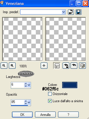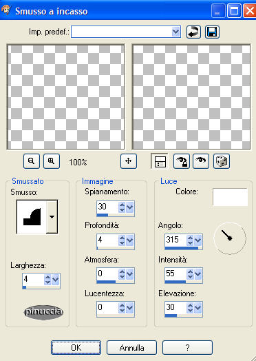 qui puoi trovare qualche risposta ai tuoi dubbi. Se l'argomento che ti interessa non è presente, ti prego di segnalarmelo. Questo tutorial è stato creato in PSP 9. Occorrente: Materiale qui Apri tutte le immagini in PSP. Animation Shop qui Ricordati di salvare spesso. Apri una nuova immagine trasparente 450 x 400 pixels. Imposta come colore di primo piano #f53c3c. Imposta come colore di sfondo #6e0e15. Oppure usa altri due colori a tua scelta (chiaro per il primo piano e scuro per lo sfondo). Passa il colore di primo piano a Gradiente di primo piano/sfondo, con i seguenti settaggi: ![]() Riempi l'immagine con il gradiente.Gli utilizzatori più esperti di PSP possono adesso scrivere 2007 (font Arial, dimensione 72), con un colore che si adatti al lavoro. Con i nodi vettori, allargare e alzare il testo, come nell'esempio. Nello zip, vi sono altre immagini da utilizzare per cambiare lo sfondo. Queste opzioni non saranno più trattate. Il tutorial continua semplicemente, in modo che possano eseguirlo anche gli utenti meno esperti. Apri MD-Monitor.psp e vai a Modifica>Copia. Torna al tuo lavoro e vai a Modifica>Incolla>Incolla come nuovo livello. Non occorre muoverlo, si trova già al posto giusto. Apri MD-Santa.psp e vai a Modifica>Copia. Torna al tuo lavoro e vai a Modifica>Incolla>Incolla come nuovo livello. Sposta il Babbo Natale contro il bordo in basso a sinistra. ![]() Apri MD-Loading-Window.psp e vai a Modifica>Copia. Torna al tuo lavoro e vai a Modifica>Incolla>Incolla come nuovo livello. Sposta questa piccola finestra sul monitor.![]() Chiudi il colore di primo piano e imposta il colore di sfondo sul bianco. Attiva lo strumento Testo , con un font largo e regolare.Io ho usato Arial, dimensione 12, pennellata 0, B per Bold, antialias selezionato o Nitido. ![]() Scrivi il tuo testo. Io ho usato "Load New Year", e poi in fondo al tutorial la versione italiana "Carica il Nuovo Anno". Se usi un altro testo, dovrai regolare la dimensione del font. Sposta il testo sul bordo blu, della finestra. ![]() Livelli>Converti in livello raster. Livelli>Unisci>Unisci tutto (appiattisci). Selezione>Seleziona tutto. Selezione>Modifica>Contrai, di 10 pixels. Selezione>Inverti. Effetti>Effetti di trama>Veneziana, colore #062f6c. ![]() Effetti>Effetti 3D>Smusso a incasso, colore bianco. ![]() Effetti>effetti 3D>Sfalsa ombra, colore nero: ![]() Ripeti l'Effetto Sfalsa ombra, ma cambiando verticale e orizzontale a -2. Selezione>Nessuna selezione. Imposta il colore di sfondo con #03369f. Scrivi 2007, con dimensione 20 pixels. Sposta il 2007 sulla finestra, tra le due cartelle. ![]() Questo potrebbe essere il momento giusto per aggiungere la firma o il tuo watermark. Livelli>Unisci>Unisci tutto (appiattisci). Apri MD-Load-Bar.psp e vai a Modifica>Copia. Torna al tuo lavoro e vai a Modifica>Incolla>Incolla come nuovo livello. Sposta nella spazio dove si controlla il carimento dei files.![]() Livelli>Unisci>Unisci tutto (appiattisci). Salva questa immagine come Immagine-lavoro.psp. Modifica>Copia. Modifica>Incolla>Incolla come nuova immagine. Salva questa immagine come Carica-nuovo-anno.psp. Ritorna alla tua Immagine-lavoro.psp. Modifica>Annulla azione Unisci tutto .Con lo strumento Selezione , rettangolo (sfumatura 0),seleziona 4 blocchi della barra di caricamento. Clicca CANC per rimuovere i blocchi. ![]() ***** Con l'animazione in blu in fondo a questo tutorial, ho rimosso due blocchi per volta. L'animazione finirà con 12 fotogrammi.****** Selezione>Nessuna selezione. Livelli>Unisci>Unisci tutto (appiattisci). Modifica>Copia. Ritorna alla nuova immagine Carica-nuovo-anno.psp. Modifica>Incolla>Incolla come nuovo livello. Ritorna alla tua Immagine-lavoro.psp. Modifica>Annulla azione Unisci tutto. Di nuovo, seleziona 4 blocchi e premi CANC. ![]() Selezione>Nessuna selezione. Livelli>Unisci>Unisci tutto (appiattisci). Modifica>Copia. Vai all'immagine Carica-nuovo-anno.psp. Modifica>Incolla>incolla come nuovo livello. Ritorna a Immagine-lavoro.psp. Modifica>Annulla azione unisci tutto. Ripeti questi passi finchè non avrai rimosso tutti i blocchi a sinistra. Alla fine: Livelli>Elimina. Alla domanda se sei sicuro, rispondi sì. Adesso rimane un solo livello, così non sarà necessario unire nulla. Copia questo singolo livello: Modifica>Copia. Vai all'immagine Carica-nuovo-anno.psp. Modifica>Incolla>incolla come nuovo livello. Salva questa immagine nuovamente come Carica-nuovo-anno. File>Salva come.... Per chi usa PSP 7 può salvare così. Per chi usa le versione superiori di PSP, poichè Animation Shop non riconosce i file .pspimage, devi salvare come file .psp. Ci sono due modi differenti. Per le vecchie versioni di PSP 8 e 9: clicca su opzioni e salva come file .psp 7 compatibile. ![]() Per le ultime versioni di PSP 9 e PSP X, esiste direttamente l'opzione salva come .psp per animation shop. Cercalo sul menu a discesa e seleziona Animation Shop (*psp). ![]() Apri il tuo Carica-nuovo-anno.psp in Animation Shop. Come vedrai, la tua animazione è composta da sette fotogrammi. Amici mi hanno chiesto come zoomare per rimpicciolire e ingrandire. Io uso sempre il tasto con il segno + e il tasto con il segno - nella tastiera numerica. In questo modo puoi vedere. Posizionati sul primo fotogramma per selezionarlo. Modifica>Seleziona tutto (oppure puoi usare Ctrl-A). Questi fotogrammi sono in ordine inverso, quindi per prima cosa occorre correggere l'ordine. Animazione>Inverti fotogrammi. ![]() Animazione>Proprietà fotogramma, imposta la velocità a 75. ![]() Salva in formato gif. ![]() ![]() Aggiornato per il 2008: ![]() ![]() Se hai problemi o dubbi, o trovi un link non funzionante, o anche soltanto per un saluto, scrivimi. Dicembre 2006 |