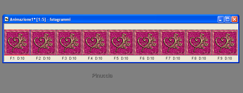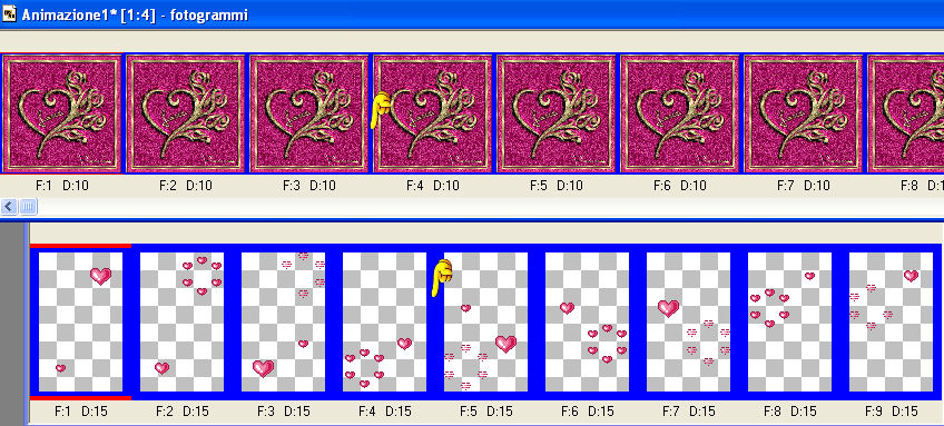 Aprilo in Animation Shop. Duplica fino a ottenere 9 fotogrammi e incolla il testo sull'animazione come hai fatto con i cuori.