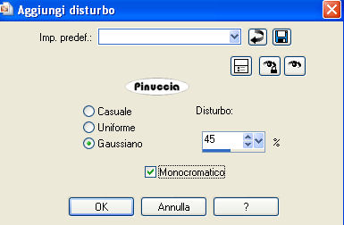 Regola>Aggiungi/Rimuovi disturbo>Aggiungi disturbo, con i settaggi a 45.
