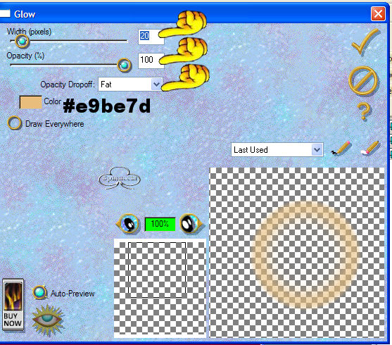Effetti>Plugins>Eye Candy 3.1>Glow, colore #e9be7d.