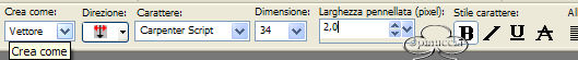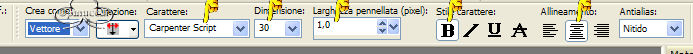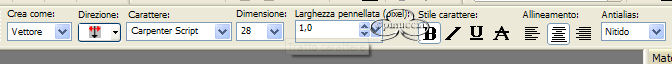 Attiva lo strumento testo e apri il font Carpenter Script fornito nello zip, dimensione 30, pennellata 1, B per Bold, antialias selezionato.