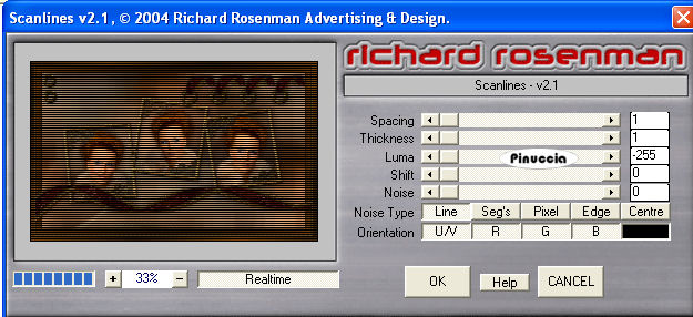 Effetti>Plugins>Richard Rosenman - Scanlines, con i settaggi standard, colore nero.