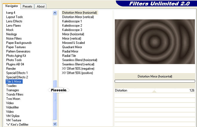 Effetti>Plugins>Filters Unlimited - Tile & Mirror - Distortion Mirror (Horizontale), con i settaggi standard.