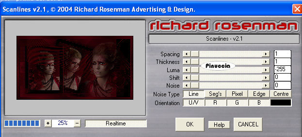 Effetti>Plugins>Richard Rosenman - Scanlines, con i seguenti settaggi, colore #000000