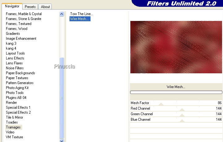 Effetti>Plugins>IC.NET Software>Filters Unlimited 2.0 - Tramages - Wire Mesh, con i settaggi standard.