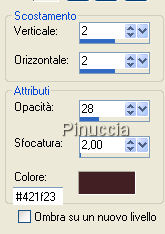 Effetti>Effetti 3D>Sfalsa ombra, con i seguenti settaggi, colore #421f23.