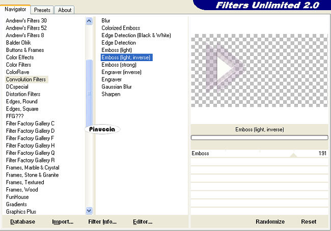 Effetti>Plugins>Filters Unlimited - Convolution Filters - Emboss (light,inverse).
