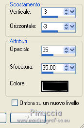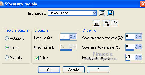 qui puoi trovare qualche risposta ai tuoi dubbi. Se l'argomento che ti interessa non è presente, ti prego di segnalarmelo. Questo tutorial è stato scritto con PSP 9, ma può essere eseguito anche con le altre versioni di PSP, a volte con qualche aggiustamento. Per chi usa X4 e X5 vedi la scheda sulla funzione Rifletti/Capovolgi qui Per tradurre il tutorial, ho usato PSP X. Occorrente: Materiale qui I tubes sono di Kitty, Nikita e Leny. Il tube Shape_BeautifulSunset è di Adriana. (in questa pagina trovi i links ai loro siti). Se vuoi condividere i tubes, per favore rispetta il lavoro degli autori, e lascia intatto il livello del watermark. Filtri se hai problemi con i Filtri consulta la mia sezione Filtri qui FM Tile Tools - Blend Emboss qui ![]() Imposta il colore di primo piano con #6e84a6. Apri una nuova immagine trasparente 700 x 500 pixels, e riempila con il colore di primo piano.Apri il tube Leny-misted82 e vai a Modifica>Copia. Torna al tuo lavoro e vai a Modifica>Incolla come nuovo livello. Immagine>Rifletti. Effetti>Plugins>FM Tile Tools - Blend Emboss, con i settaggi standard. ![]() Abbassa l'opacità di questo livello al 75%. Apri Shape_BeautifulSunset_AdrianaDesigns e vai a Modifica>Copia. Torna al tuo lavoro e vai a Modifica>Incolla come nuovo livello. Cambia la modalità di miscelatura di questo livello in Rafforza, e abbassa l'opacità all'80%. Livelli>Unisci>Unisci tutto. Modifica>Copia. Immagine>Aggiungi bordatura, 1 pixel, simmetriche, con il colore #f9f9f9. Immagine>Aggiungi bordatura, 15 pixels, simmetriche, con il colore #000000. Immagine>Aggiungi bordatura, 1 pixel, simmetriche, con il colore #f9f9f9. Immagine>Aggiungi bordatura, 25 pixels, simmetriche, con il colore #000000. Attiva lo strumento Bacchetta magica ![]() ![]() Clicca nel bordo da 25 pixels per selezionarlo. Livelli>Nuovo livello raster. Modifica>Incolla nella selezione. Regola>Sfocatura>Sfocatura radiale. ![]() Selezione>Inverti. Effetti>Effetti 3D>Sfalsa ombra. ![]() Ripeti l'Effetto Sfalsa ombra, cambiando verticale e orizzontale con -2. Selezione>Deseleziona. Apri il tube 12926131188_animaux_nikita e vai a Modifica>Copia. Torna al tuo lavoro e vai a Modifica>Incolla come nuovo livello. (elimina il watermark). Immagine>Ridimensiona, al 50%, tutti i livelli non selezionato. ![]() Regola>Messa a fuoco>Maschera di contrasto. ![]() Sposta il tube a sinistra, un po' più in basso(vedi il mio esempio). Effetti>Effetti 3D>Sfalsa ombra. ![]() Apri il tube Kittys-Zoetica e vai a Modifica>Copia. Torna al tuo lavoro e vai a Modifica>Incolla come nuovo livello. Immagine>Ridimensiona, al 90%, tutti i livelli non selezionato. Regola>Messa a fuoco>Metti a fuoco - 2 volte. Posiziona correttamente il tube.Effetti>Effetti 3D>Sfalsa ombra, con i settaggi precedenti. Attiva lo strumento Selezione , rettangolo,![]() e seleziona la parte del tube sui bordi. ![]() Premi sulla tastiera il tasto CANC ![]() Selezione>Deseleziona. Immagine>Aggiungi bordatura, 2 pixels, simmetriche, con il colore #000000. Aggiungi il tuo nome e/o il tuo watermark su un nuovo livello. Livelli>Unisci>Unisci tutto e salva in formato jpg. ![]() Se hai problemi o dubbi, o trovi un link non funzionante, o anche soltanto per dirmi che ti è piaciuto, scrivimi 20 Luglio 2013 |