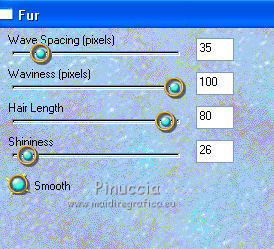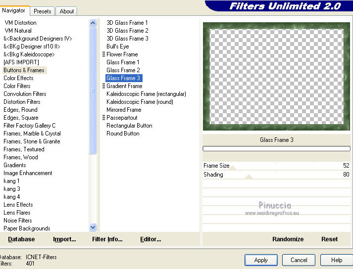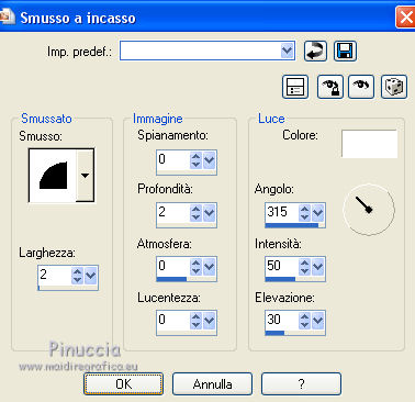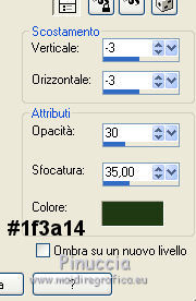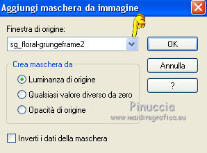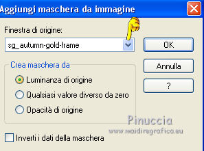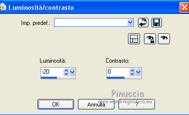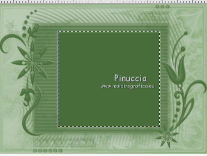 qui puoi trovare qualche risposta ai tuoi dubbi. Se l'argomento che ti interessa non è presente, ti prego di segnalarmelo. Questo tutorial è stato scritto con PSP 9, ma può essere eseguito anche con le altre versioni di PSP, a volte con qualche aggiustamento. Per chi usa X4 e X5 vedi la scheda sulla funzione Rifletti/Capovolgi qui Per tradurre il tutorial, ho usato PSP X. Occorrente: Materiale qui I tubes sono di Kitty, Angie, Brigitte e Mariel. La maschera è di EssexGirl. (in questa pagina trovi i links ai loro siti). Se vuoi condividere i tubes, per favore rispetta il lavoro degli autori, e lascia intatto il livello del watermark. Filtri se hai problemi con i Filtri consulta la mia sezione Filtri qui Filters Unlimited 2.0 qui Eye Candy 3.1 qui ![]() Imposta il colore di primo piano con #b9cab2, e il colore di sfondo con #54624e. Apri una nuova immagine trasparente 700 x 500 pixels, e riempila con il colore di primo piano.Livelli>Nuovo livello raster. Riempi con il colore di sfondo.Livelli>Nuovo livello maschera>Da immagine. Apri il menu sotto la finestra di origine e vedrai la lista dei files aperti. Seleziona la maschera sg_autumn-gold-frame, con i seguenti settaggi: ![]() Livelli>Unisci>Unisci gruppo. Cambia la modalità di miscelatura di questo livello in Rafforza, e abbassa l'opacità all'80%. Imposta il colore di primo piano con #486d3a. Livelli>Nuovo livello raster. Riempi con il colore di primo piano.Livelli>Nuovo livello maschera>Da immagine. Apri il menu sotto la finestra di origine e seleziona la maschera sg_floral-grungeframe2, con i seguenti settaggi: ![]() Livelli>Unisci>Unisci gruppo. Livelli>Nuovo livello raster. Attiva lo strumento Selezione , rettangolo,![]() Traccia un rettangolo all'interno della maschera. ![]() Apri il tube PAY-S2007-20. Immagine>Rifletti. Modifica>Copia. Torna al tuo lavoro e vai a Modifica>Incolla nella selezione. Selezione>Deseleziona. Cambia la modalità di miscelatura di questo livello in Luce netta. Apri il tube Mtm-Plant010-2007 e vai a Modifica>Copia. Torna al tuo lavoro e vai a Modifica>Incolla come nuovo livello. Immagine>Rifletti. Immagine>Ridimensiona, al 65%, tutti i livelli non selezionato. ![]() Regola>Luminosità e contrasto>Luminosità e contrasto. ![]() Regola>Messa a fuoco>Metti a fuoco. Spostalo a sinistra e un po' più in basso(vedi il mio esempio). Effetti>Effetti 3D>Sfalsa ombra, con il colore #1f3a14. ![]() Cambia la modalità di miscelatura di questo livello in luminanza (esistente). Apri il tube Marif_2006_misted_fleurs097 e vai a Modifica>Copia. Torna al tuo lavoro e vai a Modifica>Incolla come nuovo livello. Immagine>Rifletti. Immagine>Ridimensiona, al 75%, tutti i livelli non selezionato. Spostalo in basso a sinistra.Cambia la modalità di miscelatura di questo livello in luminanza (esistente). ![]() Apri il tube Kittys-Karcia e vai a Modifica>Copia. Torna al tuo lavoro e vai a Modifica>Incolla come nuovo livello. Immagine>Ridimensiona, al 65%, tutti i livelli non selezionato. Regola>Messa a fuoco>Maschera di contrasto. ![]() Spostalo in basso a destra.![]() Effetti>Effetti 3D>Sfalsa ombra, con i settaggi precedenti. Immagine>Aggiungi bordatura, 1 pixel, simmetriche, con il colore #b9cab2. Immagine>Aggiungi bordatura, 35 pixels, simmetriche, con il colore #486d3a. Seleziona il bordo da 35 pixels con la bacchetta magica ![]() ![]() Livelli>Nuovo livello raster. Riempi con il colore di primo piano.Effetti>Plugins>Eye Candy 3.1 - Fur. ![]() Cambia la modalità di miscelatura di questo livello in Sovrapponi. Effetti>Plugins>Filters Unlimited 2.0 - Buttons & Frames - Glass Frame 3. ![]() Selezione>Deseleziona. Immagine>Aggiungi bordatura, 1 pixel, simmetriche, con il colore #b9cab2. Immagine>Aggiungi bordatura, 15 pixels, simmetriche, con il colore #486d3a. Immagine>Aggiungi bordatura, 5 pixels, simmetriche, con il colore #b9cab2. Immagine>Aggiungi bordatura, 15 pixels, simmetriche, con il colore #486d3a. Immagine>Aggiungi bordatura, 1 pixel, simmetriche, con il colore #b9cab2. Seleziona il bordo chiaro da 5 pixels con la bacchetta magica ![]() Effetti>Effetti 3D>Smusso a incasso. ![]() Selezione>Deseleziona. Aggiungi il tuo nome e/o il tuo watermark su un nuovo livello. Livelli>Unisci>Unisci tutto e salva in formato jpg. ![]() Se hai problemi o dubbi, o trovi un link non funzionante, o anche soltanto per dirmi che ti è piaciuto, scrivimi 29 Luglio 2013 |