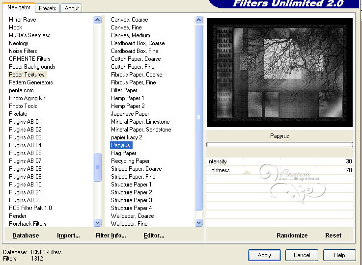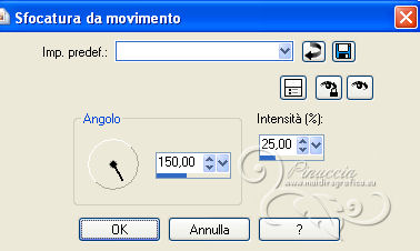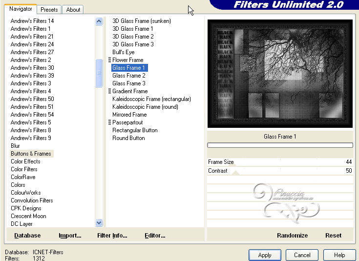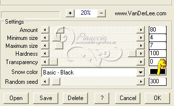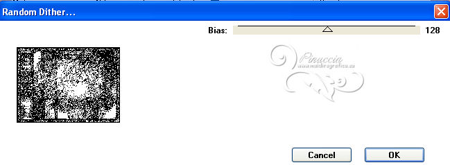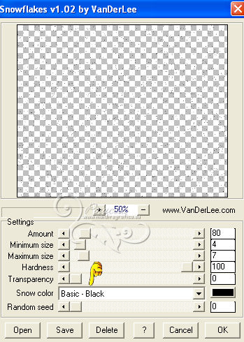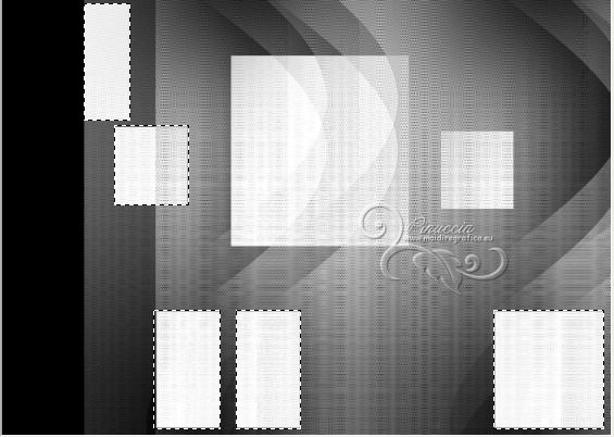 qui puoi trovare qualche risposta ai tuoi dubbi. Se l'argomento che ti interessa non è presente, ti prego di segnalarmelo. Questo tutorial è stato scritto con PSP 9. Per tradurlo, ho usato PSP X. Occorrente: Materiale qui I tubes sono di Leny e Marif. La maschera è di Monaiekje. (in questa pagina trovi i links ai loro siti). Se vuoi condividere i tubes, per favore rispetta il lavoro degli autori, e lascia intatto il livello del watermark. Filtri se hai problemi con i Filtri consulta la mia sezione Filtri qui FM Tile Tools - Blend Emboss qui VanDerLee - Snowflakes qui Filters Unlimited 2.0 qui Unplugged Effects qui Animation Shop qui ![]() Imposta il colore di primo piano con #000000, e il colore di sfondo con #ffffff. Passa il colore di primo piano a Gradiente, stile Sprazzo di luce. ![]() Apri la maschera di Monaiekje "mask20". Duplicala usando la combinazione di tasti maiuscola+D e chiudi l'originale. La copia sarà la base del tuo lavoro. Immagine>Ridimensiona, 700 x 500 pixels, mantieni proporzioni non selezionato. ![]() Livelli>Nuovo livello raster. Attiva lo strumento Selezione , rettangolo![]() e traccia una selezione dei rettangoli indicati nella schermata. ![]() Riempi le selezioni con il gradiente.Regola>Sfocatura>Sfocatura gaussiana - raggio 20. ![]() Mantieni selezionato. Apri il tube Marif_2007_misted_paysage081 e vai a Modifica>Copia. Torna al tuo lavoro e vai a Modifica>Incolla nella selezione. Effetti>Plugins>FM Tile Tools - Blend Emboss - 2 volte con i settaggi standard. ![]() Selezione>Deseleziona. Livelli>Unisci>Unisci giù. Effetti>Effetti 3D>Sfalsa ombra. ![]() Ripeti l'Effetto Sfalsa ombra, cambiando verticale e orizzontale con -2. Apri il tube Marif_2007_misted_paysage081 e vai a Modifica>Copia. Torna al tuo lavoro e vai a Modifica>Incolla come nuovo livello. Immagine>Ridimensiona, al 65%, tutti i livelli non selezionato. ![]() Effetti>Plugins>FM Tile Tools - Blend Emboss, con i settaggi standard. Sposta il tube in alto a destra.(vedi il mio esempio). Cambia la modalità di miscelatura di questo livello in Moltiplica, e abbassa l'opacità all'88%. Apri il testo Black rain e vai a Modifica>Copia. Torna al tuo lavoro e vai a Modifica>Incolla come nuovo livello. Spostalo dove preferisci o vedi il mio esempio.Livelli>Unisci>Unisci tutto. Riporta il colore di primo piano a Colore. Livelli>Nuovo livello raster. Selezione>Seleziona tutto. Riempi con il colore di primo piano.Selezione>Modifica>Contrai - 2 pixels. Premi sulla tastiera il tasto CANC ![]() Selezione>Deseleziona. Immagine>Aggiungi bordatura, 15 pixels, simmetriche, con il colore #404040. Immagine>Aggiungi bordatura, 35 pixels, simmetriche, con il colore #000000. Attiva lo strumento Bacchetta magica ![]() ![]() Clicca nel bordo da 15 pixels per selezionarlo. Effetti>Plugins>Unplugged Effects - Random Dither. ![]() Livelli>Nuovo livello raster. Riempi con il colore di primo piano.Abbassa l'opacità di questo livello al 70%. Selezione>Deseleziona. Livelli>Unisci>Unisci tutto. Effetti>Plugins>Filters Unlimited 2.0 - Paper Textures - Papyrus. ![]() Effetti>Plugins>Filters Unlimited 2.0 - Buttons &Frames - Glass Frame 1. ![]() Apri il tube Leny-vrouw314 e vai a Modifica>Copia. Torna al tuo lavoro e vai a Modifica>Incolla come nuovo livello. Immagine>Rifletti. Immagine>Ridimensiona, all'80%, tutti i livelli non selezionato. Regola>Messa a fuoco>Maschera di contrasto. ![]() Spostalo in alto, (sul bordo da 15 pixels)e un po' più a destra. Effetti>Effetti 3D>Sfalsa ombra. ![]() Aggiungi il tuo nome e/o il tuo watermark su un nuovo livello. Se non vuoi animare il lavoro: Livelli>Unisci>Unisci tutto e salva in formato jpg. Per l'animazione, non unire i livelli e attiva il livello di sfondo. Attiva lo strumento Selezione , rettangolo,e seleziona il riquadro centrale ![]() Effetti>Plugins>VDL Adrenaline - Snowflakes. se stai usando la versione 1.02 del filtro: Effetti>VanDerLee>Snowflakes. ![]() Regola>Sfocatura>Sfocatura da movimento. ![]() Selezione>Deseleziona. Modifica>Copia Unione. Apri Animation Shop e vai a Modifica>Incolla>Incolla come nuova animazione. Torna in PSP. Modifica>Annulla azione Deseleziona. Modifica>Annulla azione Sfocatura da movimento. Modifica>Annulla azione Snowflakes. Ripeti l'Effetto Snowflakes, cambiando Random Seed con 300. ![]() Regola>Sfocatura>Sfocatura da movimento, con i settaggi precedenti. Selezione>Deseleziona. Modifica>Copia Unione. Torna in Animation Shop e vai a Modifica>Incolla>Incolla dopo il fotogramma corrente. Di nuovo in PSP. Annulla gli ultimi tre passaggi, come hai fatto prima. Ripeti l'Effetto Snowflakes cambiando Random Seed con 600. Regola>Sfocatura>Sfocatura da movimento, con gli stessi settaggi. Selezione>Deseleziona. Modifica>Copia Unione. In Animation Shop: Modifica>Incolla>Incolla dopo il fotogramma corrente. Di nuovo in PSP. Annulla gli ultimi tre passaggi, come hai fatto prima. Ripeti l'Effetto Snowflakes cambiando Random Seed con 900. Regola>Sfocatura>Sfocatura da movimento, con gli stessi settaggi. Selezione>Deseleziona. Modifica>Copia Unione. In Animation Shop: Modifica>Incolla>Incolla dopo il fotogramma corrente. Modifica>Seleziona tutto. Animazione>Proprietà fotogramma e imposta la velocità a 26. ![]() Controlla il risultato cliccando su Visualizza e salva in formato gif.![]() Se hai problemi o dubbi, o trovi un link non funzionante, o anche soltanto per dirmi che ti è piaciuto, scrivimi 11 Aprile 2013 |
