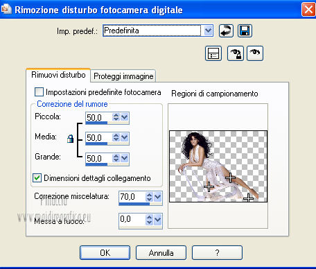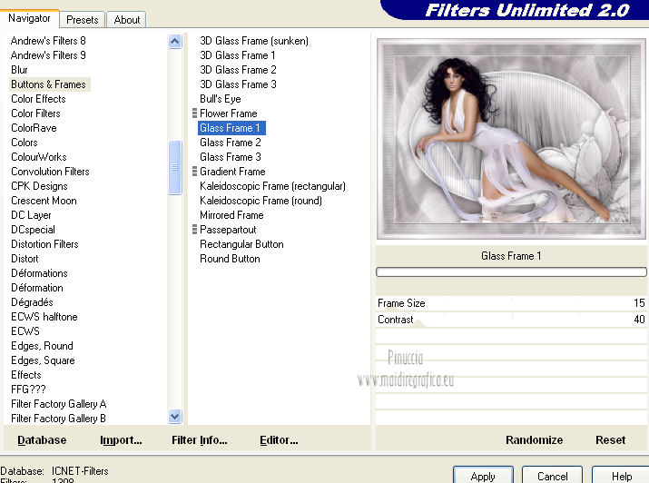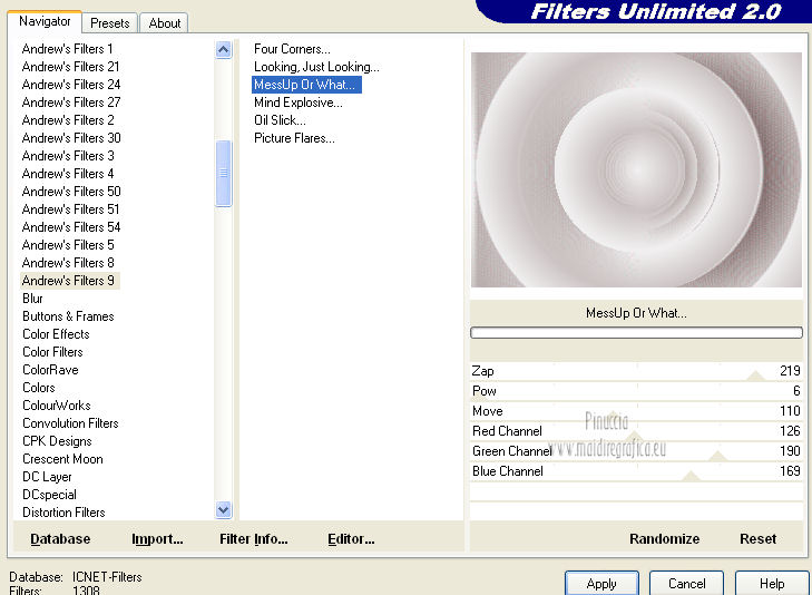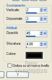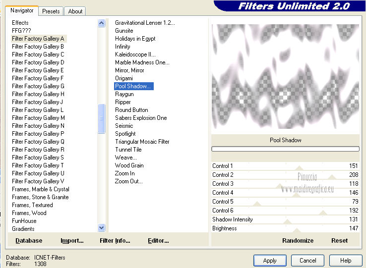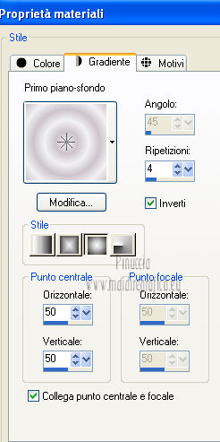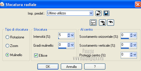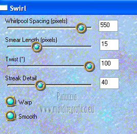 qui puoi trovare qualche risposta ai tuoi dubbi. Se l'argomento che ti interessa non è presente, ti prego di segnalarmelo. Questo tutorial è stato scritto con PSP 9. Per tradurlo, ho usato PSP X. Occorrente: Materiale qui I tubes Gerry e Mou. Ovaal_cold è di Adriana. (in questa pagina trovi i links ai loro siti). Se vuoi condividere i tubes, per favore rispetta il lavoro degli autori, e lascia intatto il livello del watermark. Filtri Andrew's Filters 9 qui Filter Factory Gallery A qui Filters Unlimited 2.0 qui Eye Candy 3.1 qui I filtri Factory Gallery e Andrews per essere usati devono prima essere convertiti. Come fare vedi qui Si usano importandoli in Filters Unlimited (come fare vedi qui) ma possono funzionare anche da soli. I filtri forniti sono stati già convertiti. ![]() Imposta il colore di primo piano con #ccc4ca, e il colore di sfondo con #f2f1f3. Passa il colore di primo piano a Gradiente. ![]() Apri una nuova immagine trasparente 700 x 500 pixels, e riempila con il gradiente.Livelli>Duplica - 2 volte. Chiudi i livelli delle copie e attiva il livello inferiore (Raster 1). Effetti>Plugins>Filters Unlimited 2.0 - Andrew's Filter 9 - Mess Up or What. ![]() Apri e attiva il livello soprastante (copia di Raster 1). Effetti>Plugins>Eye Candy 3.1 - Swirl. ![]() Abbassa l'opacità di questo livello al 60%. Apri e attiva il livello superiore della seconda copia di Raster 1. Effetti>Plugins>Filters Unlimited 2.0 - Filter Factory Gallery A - Pool Shadow. ![]() Cambia la modalità di miscelatura di questo livello in Moltiplica, e abbassa l'opacità al 60%. Dovresti avere questo. ![]() Apri Ovaal_cold_Adriana_Designs e vai a Modifica>Copia. Torna al tuo lavoro e vai a Modifica>Incolla come nuovo livello. Apri il tube mou_waterflower e vai a Modifica>Copia. Torna al tuo lavoro e vai a Modifica>Incolla come nuovo livello. Spostalo in basso a destra, come nel mio esempio.Cambia la modalità di miscelatura di questo livello in Luminanza (esistente) e abbassa l'opacità al 60%. Effetti>Effetti 3D>Sfalsa ombra. ![]() Livelli>Duplica. Immagine>Rifletti. Spostalo un po' più in basso del fiore precedente.![]() Apri il tube Gerry-Lady 228 e vai a Modifica>Copia. Torna al tuo lavoro e vai a Modifica>Incolla come nuovo livello. Immagine>Ridimensiona, al 95%, tutti i livelli non selezionato. ![]() Regola>Rimozione disturbo fotocamera digitale. ![]() Regola>Messa a fuoco>Metti a fuoco. Sposta il tube in basso a destra.Effetti>Effetti 3D>Sfalsa ombra, con i settaggi precedenti. Chiudi il livello del tube della donna. Modifica>Copia Unione. Riapri il livello del tube. Immagine>Aggiungi bordatura, 1 pixel, simmetriche, con il colore #f2f1f3. Immagine>Aggiungi bordatura, 35 pixels, simmetriche, con il colore #ccc4ca. Immagine>Aggiungi bordatura, 1 pixel, simmetriche, con il colore #f2f1f3. 0 Immagine>Aggiungi bordatura, 15 pixels, simmetriche, con il colore #ccc4ca. Immagine>Aggiungi bordatura, 1 pixel, simmetriche, con il colore #f2f1f3. Seleziona il bordo da 35 pixels con la bacchetta magica ![]() ![]() Modifica>Incolla nella selezione. Regola>Sfocatura>Sfocatura radiale. ![]() Mantieni selezionato. Livelli>Nuovo livello raster. Riempi con il colore di sfondo.Effetti>Effetti di trama>Veneziana. ![]() Selezione>Deseleziona. Abbassa l'opacità di questo livello al 30%. Attiva nuovamente il livello di sfondo. Seleziona il bordo da 15 pixels con la bacchetta magica ![]() e riempilo con il gradiente.Selezione>Seleziona tutto. Selezione>Modifica>Contrai 50 pixels. Effetti>Effetti 3D>Sfalsa ombra. ![]() Selezione>Deseleziona. Livelli>Unisci>Unisci tutto. Effetti>Plugins>Filters Unlimited 2.0 - Buttons & Frames - Glass Frame 1. ![]() Apri il file di testo "cold as ice" e vai a Modifica>Copia. Torna al tuo lavoro e vai a Modifica>Incolla come nuovo livello. Spostalo dove preferisci o vedi il mio esempio.Aggiungi il tuo nome e/o il tuo watermark su un nuovo livello. Livelli>Unisci>Unisci tutto e salva in formato jpg. ![]() Se hai problemi o dubbi, o trovi un link non funzionante, o anche soltanto per dirmi che ti è piaciuto, scrivimi 27 Ottobre 2012 |