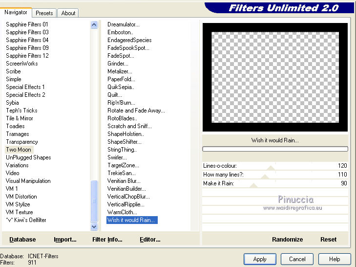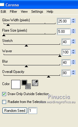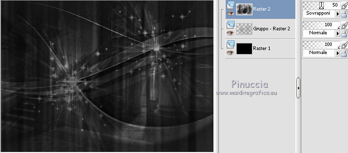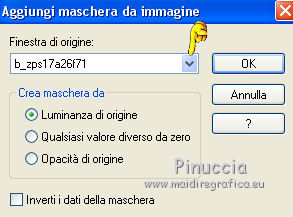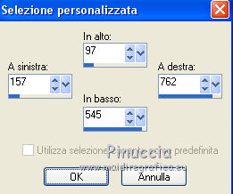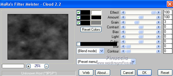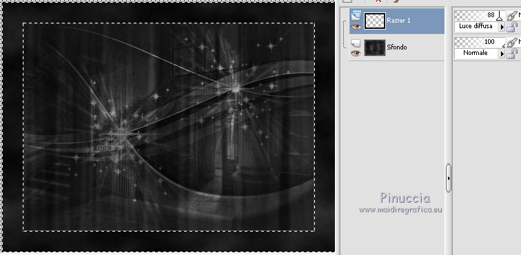qui puoi trovare qualche risposta ai tuoi dubbi. Se l'argomento che ti interessa non è presente, ti prego di segnalarmelo. Questo tutorial è stato scritto con PSP 9. Dalla versione X4, il comando Immagine>Rifletti è stato sostituito con Immagine>Capovolgi in orizzontale, e il comando Immagine>Capovolgi con Immagine>Capovolgi in verticale. Nelle versioni X5 e X6, le funzioni sono state migliorate rendendo disponibile il menu Oggetti. Vedi la scheda sull'argomento qui Per tradurre questo tutorial ho usato PSP X. Occorrente: Materiale qui Per i tubes grazie Kitty e Guismo. Non conosco l'autore della maschera. (in questa pagina trovi i links ai loro siti). Se vuoi condividere i tubes, per favore rispetta il lavoro degli autori, e lascia intatto il livello del watermark. Filtri: in caso di dubbi, ricorda di consultare la mia sezione filtri qui Mura's Meister - Cloud qui Filters Unlimited 2.0 qui Eye Candy 4000 qui Two Moon qui I filtri Two Moon si possono usare da soli o importati in Filters Unlimited (come fare vedi qui) Se un filtro fornito appare con questa icona Animation Shop qui ![]() Apri la maschera in PSP e minimizzala con il resto del materiale. Imposta il colore di primo piano con #000000, e il colore di sfondo con #808080. Apri una nuova immagine trasparente 700 x 500 pixels, e riempila con il colore di primo piano.Livelli>Nuovo livello raster. Riempi con il colore di sfondo.Livelli>Nuovo livello maschera>Da immagine. Apri il menu sotto la finestra di origine e vedrai la lista dei files aperti. Seleziona la maschera b_zps17a26f71, con i seguenti settaggi. ![]() Livelli>Unisci>Unisci gruppo. Regola>Messa a fuoco>Metti a fuoco. Livelli>Nuovo livello raster. Selezione>Seleziona tutto. Apri il tube calguismistescalier26810. Rimani sul tube. Attiva lo strumento Selezione ![]() clicca sull'icona Selezione personalizzata ![]() e imposta i seguenti settaggi. ![]() Modifica>Copia. Torna al tuo lavoro e vai a Modifica>Incolla nella selezione. Selezione>Deseleziona. Cambia la modalità di miscelatura di questo livello in Sovrapponi, e abbassa l'opacità al 50%. ![]() Aggiungi il tuo nome e/o il tuo watermark su un nuovo livello. Immagine>Aggiungi bordatura, 1 pixel, simmetriche, con il colore nero #000000. Immagine>Aggiungi bordatura, 2 pixels, simmetriche, coni l colore bianco #ffffff. Immagine>Aggiungi bordatura, 50 pixels, simmetriche, con il colore nero #000000. Attiva lo strumento Bacchetta magica ![]() ![]() e clicca nel bordo da 50 pixels per selezionarlo. Effetti>Plugins>Mura's Meister - Cloud. ![]()