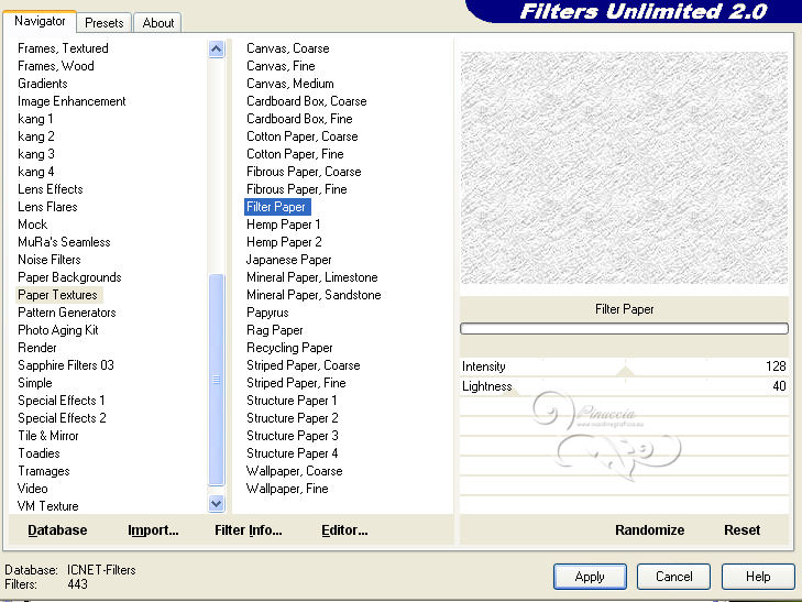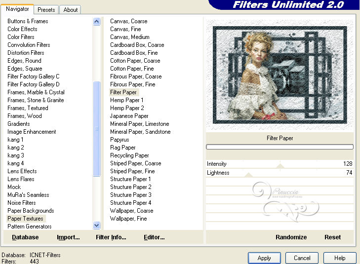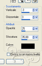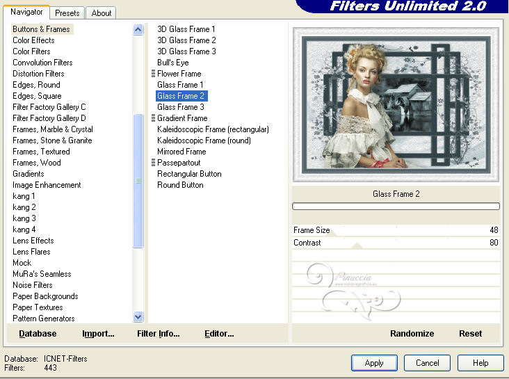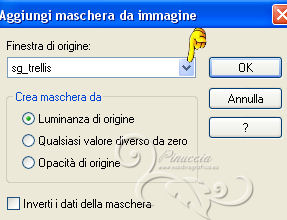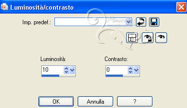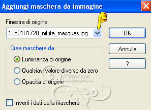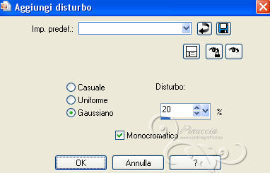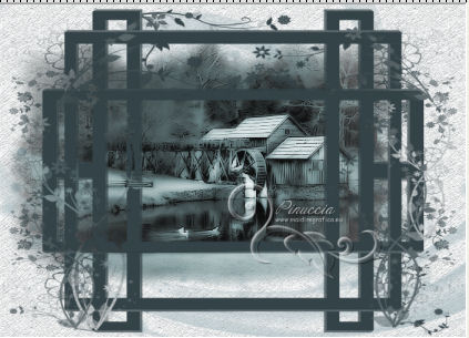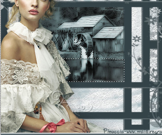 qui puoi trovare qualche risposta ai tuoi dubbi. Se l'argomento che ti interessa non è presente, ti prego di segnalarmelo. Questo tutorial è stato scritto con PSP 9. Per tradurlo, ho usato PSP X. Occorrente: Materiale qui I tubes sono di Yoka e Suzi Sgai. Le maschere sono di EssexGirl e Nikita. (in questa pagina trovi i links ai loro siti). Se vuoi condividere i tubes, per favore rispetta il lavoro degli autori, e lascia intatto il livello del watermark. Filtri se hai problemi con i Filtri consulta la mia sezione Filtri qui Filters Unlimited 2.0 qui Animation Shop qui ![]() Apri le maschera in PSP e minimizzale con il resto del materiale. Imposta il colore di primo piano con #ffffff, e il colore di sfondo con #a8bcc2. Apri una nuova immagine trasparente 700 x 500 pixels, e riempila con il colore di primo piano.Livelli>Duplica. Effetti>Plugins>Filters Unlimited 2.0 - Paper Textures - Filter Paper. ![]() Livelli>Nuovo livello raster. Riempi con il colore di sfondo.Livelli>Nuovo livello maschera>Da immagine. Apri il menu sotto la finestra di origine e vedrai la lista dei files aperti. Seleziona la maschera 1250181728_nikita_masques, con i seguenti settaggi: ![]() Livelli>Unisci>Unisci gruppo. Imposta il colore di sfondo con #344348. Livelli>Nuovo livello raster. Riempi con il colore di sfondo.Livelli>Nuovo livello maschera>Da immagine. Apri il menu sotto la finestra di origine e seleziona la maschera sg_trellis, con i seguenti settaggi: ![]() Livelli>Unisci>Unisci gruppo. Apri il tube SS_2108 e vai a Modifica>Copia. Torna al tuo lavoro e vai a Modifica>Incolla come nuovo livello. Immagine>Rifletti. Regola>Tonalità e saturazione>Viraggio. ![]() Regola>Luminosità e contrasto>Luminosità e contrasto. ![]() Livelli>Disponi>Sposta giù. Spostalo un po' più in alto a sinistra.![]() Attiva lo strumento Gomma ![]() e cancella le parti eccedenti del tube. ![]() Attiva il livello superiore. Apri il tube Yoka_Photos_Lady-in-White e vai a Modifica>Copia. Torna al tuo lavoro e vai a Modifica>Incolla come nuovo livello. Immagine>Ridimensiona, una volta all'80%, e una volta al 90%, tutti i livelli non selezionato. ![]() Regola>Messa a fuoco>Maschera di contrasto. ![]() Spostalo a sinistra e un po' più in basso.Effetti>Effetti 3D>Sfalsa ombra. ![]() Aggiungi il tuo nome e/o il tuo watermark su un nuovo livello. Immagine>Aggiungi bordatura, 2 pixels, simmetriche, con il colore bianco #ffffff. Immagine>Aggiungi bordatura, 20 pixels, simmetriche, con il colore bianco #344348. Immagine>Aggiungi bordatura, 35 pixels, simmetriche, con il colore bianco #ffffff. Attiva lo strumento Bacchetta magica ![]() ![]() Clicca nel bordo da 35 pixels per selezionarlo. Effetti>Plugins>Filters Unlimited 2.0 - Paper Texture - Filter Paper, con i settaggi standard. ![]() Selezione>Deseleziona. Effetti>Plugins>Filters Unlimited - Buttons & Frames - Glass Frame 2: ![]() ***Animazione*** Attiva lo strumento Selezione a mano libera ![]() ![]() e seleziona la parte mostrata nella schermata ![]() Regola>Aggiungi/Rimuovi disturbo>Aggiungi disturbo. ![]() Selezione>Deseleziona. Modifica>Copia. Apri Animation Shop e vai a Modifica>Incolla>Incolla come nuova animazione. Torna in PSP. Modifica>Annulla azione Deseleziona. Modifica>Annulla azione Aggiungi disturbo. Regola>Aggiungi/Rimuovi disturbo>Aggiungi disturbo, e porta il disturbo a 25. Selezione>Deseleziona. Modifica>Copia. Torna in Animation Shop e vai a Modifica>Incolla>Incolla dopo il fotogramma corrente. Di nuovo in PSP. Modifica>Annulla azione Deseleziona. Modifica>Annulla azione Aggiungi disturbo. Regola>Aggiungi/Rimuovi disturbo/Aggiungi disturbo, e porta il disturbo a 30. Selezione>Deseleziona. Modifica>Copia. In Animation Shop: Modifica>Incolla>Incolla dopo il fotogramma corrente. Ancora in PSP. Modifica>Annulla azione Deseleziona. Modifica>Annulla azione Aggiungi disturbo. Regola>Aggiungi/Rimuovi disturbo/Aggiungi disturbo, imposta il disturbo nuovamente a 25. Selezione>Deseleziona. Modifica>Copia. In Animation Shop: Modifica>Incolla>Incolla dopo il fotogramma corrente. E avrai una animazione composta da 4 fotogrammi. Modifica>Seleziona tutto. Animazione>Proprietà fotogrammi e imposta la velocità a 26. Controlla il risultato cliccando su Visualizza ![]() e salva in formato gif. ![]() Se hai problemi o dubbi, o trovi un link non funzionante, o anche soltanto per dirmi che ti è piaciuto, scrivimi 10 Agosto 2013 |