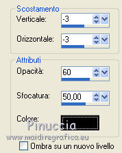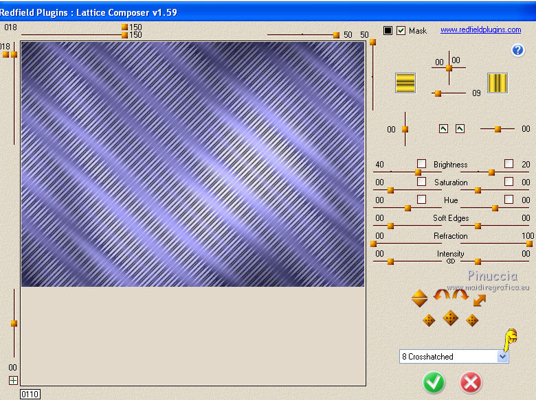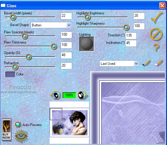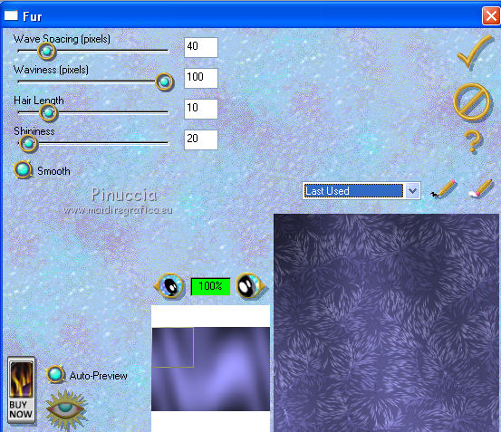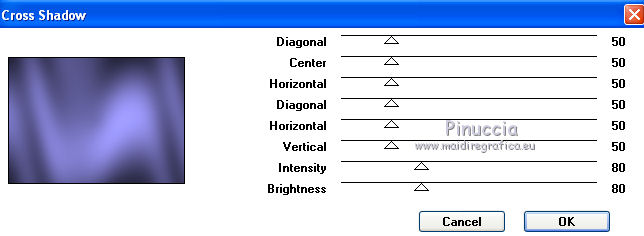qui puoi trovare qualche risposta ai tuoi dubbi. Se l'argomento che ti interessa non è presente, ti prego di segnalarmelo. Questo tutorial è stato scritto con PSP 9. Per tradurlo, ho usato PSP X. Occorrente: Materiale qui I tubes usati sono di Kitty, Nikita e Mou. (in questa pagina trovi i links ai loro siti). Se vuoi condividere i tubes, per favore rispetta il lavoro degli autori, e lascia intatto il livello del watermark. Filtri Graphics Plus - Cross Shadow qui Eye Candy 3.1 qui Redfield qui ![]() Imposta il colore di primo piano con #6765a6. Apri una nuova immagine trasparente 700 x 500 pixels, e riempila con il colore di primo piano.Livelli>Duplica. Effetti>Plugins>Graphics Plus - Cross Shadow. ![]() Effetti>Plugins>Redfield - Lattice Composer. seleziona 8Crosshatched e ok. ![]() Cambia la modalità di miscelatura di questo livello in Filtra, e abbassa l'opacità al 40%. Livelli>Nuovo livello raster. Riempi con il colore di primo piano.Effetti>Plugins>Graphics Plus - Cross Shadow, con i settaggi precedenti. Effetti>Plugins>Eye Candy 3.1 - Fur. ![]() Cambia la modalità di miscelatura di questo livello in Filtra, e abbassa l'opacità all'80%. Apri il tube 12930422230_divers_Nikita e vai a Modifica>Copia. Torna al tuo lavoro e vai a Modifica>Incolla come nuovo livello. Immagine>Capovolgi. Immagine>Rifletti. Spostalo in basso a sinistra, sul bordo.(vedi il mio esempio). Cambia la modalità di miscelatura di questo livello in Luminanza (esistente), e abbassa l'opacità all'80%. Modifica>Incolla come nuovo livello (il tube è ancora in memoria). Spostalo in alto a destra, contro il bordo.Cambia la modalità di miscelatura di questo livello in Luminanza (Esistente), e abbassa l'opacità al 44%. ![]() Apri il tube Kittys-Dreamwoman e vai a Modifica>Copia. Torna al tuo lavoro e vai a Modifica>Incolla come nuovo livello. Immagine>Ridimensiona, al 90%, tutti i livelli non selezionato. ![]() Regola>Rimozione disturbo fotocamera digita. ![]() Regola>Messa a fuoco>Metti a fuoco. Spostalo a destra e un po' più in basso.Effetti>Effetti 3D>Sfalsa ombra. ![]() Effetti>Effetti 3D>Sfalsa ombra, con i settaggi precedenti. Apri il tube mou_flowers, e vai a Modifica>Copia. Torna al tuo lavoro e vai a Modifica>Incolla come nuovo livello. Immagine>Ridimensiona, al 90%, tutti i livelli non selezionato. Spostalo in basso a sinistra.![]() Effetti>Effetti 3D>Sfalsa ombra, con i settaggi precedenti. Immagine>Aggiungi bordatura, 2 pixels, simmetriche, con il colore di #66649d. Immagine>Aggiungi bordatura, 5 pixels, simmetriche, con il colore bianco #ffffff. Immagine>Aggiungi bordatura, 2 pixels, simmetriche, con il colore #66649d. Immagine>Aggiungi bordatura, 30 pixels, simmetriche, con il colore bianco #ffffff. Immagine>Aggiungi bordatura, 2 pixels, simmetriche, con il colore #66649d. Immagine>Aggiungi bordatura, 5 pixels, simmetriche, con il colore bianco #ffffff. Immagine>Aggiungi bordatura, 2 pixels, simmetriche, con il colore #66649d. Seleziona il bordo da 30 pixels con la bacchetta magica ![]() ![]() Effetti>Plugins>Eye Candy 3.1 - Glass. ![]() Selezione>Deseleziona. Seleziona i due bordi bianchi da 5 pixels con la bacchetta magica ![]() ![]() Effetti>Effetti 3D>Smusso a incasso. ![]() Selezione>Deseleziona. Apri il file di testo Dear Mom e vai a Modifica>Copia. Torna al tuo lavoro e vai a Modifica>Incolla come nuovo livello. Spostalo dove preferisci o vedi il mio esempio.Aggiungi il tuo nome e/o il tuo watermark su un nuovo livello. Livelli>Unisci>Unisci tutto e salva in formato jpg. ![]() Se hai problemi o dubbi, o trovi un link non funzionante, o anche soltanto per dirmi che ti è piaciuto, scrivimi 16 Aprile 2012 |