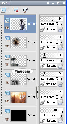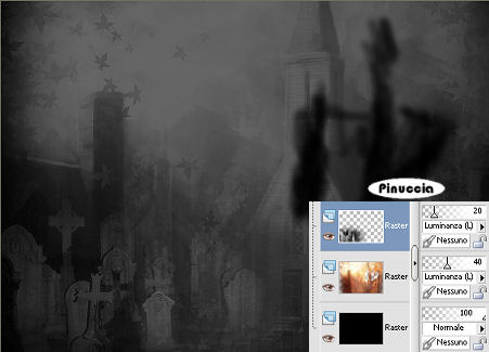 qui puoi trovare qualche risposta ai tuoi dubbi. Se l'argomento che ti interessa non è presente, ti prego di segnalarmelo. Questo tutorial è stato scritto in PSP 9, ma può essere eseguito con qualsiasi versione del programma. Occorrente: Materiale qui I tubes usati per questo tutorial sono di Yoka, Monique, Hans, Angie e Silke Se vuoi condividere i tubes, per favore rispetta il lavoro degli autori, e lascia intatto il livello del watermark. (in questa pagina trovi i links ai siti dei creatori di tubes) Filtri: Photo Effex qui Bordermania qui Apri una nuova immagine trasparente 700 x 500 pixels. Imposta il colore di primo piano con il nero #000000, e il colore di sfondo con #404040. Riempi l'immagine trasparente con il colore di primo piano.Apri il tube Yoka-Misted-Miscdecor-RavoJ-160907, e vai a Modifica>Copia. Torna al tuo lavoro e vai a Modifica>Incolla>Incolla come nuovo livello. Cambia la modalità di miscelatura di questo livello in Luminanza (esistente), e abbassa l'opacità al 40%. ![]() Apri il tube hjr_misted_graveyard1, e vai a Modifica>Copia. Torna al tuo lavoro e vai a Modifica>Incolla>Incolla come nuovo livello. Immagine>Rifletti. Sposta il tube in basso a sinistra.Cambia la modalità di miscelatura di questo livello in Luminanza (esistente), e abbassa l'opacità al 20%. ![]() Apri il tube SKF_CryingEye132, e vai a Modifica>Copia. Torna al tuo lavoro e vai a Modifica>Incolla>INcolla come nuovo livello. Sposta questo tube a sinistra.Cambia la modalità di miscelatura di questo livello in Luminanza (esistente), e abbassa l'opacità al 20%. ![]() Apri il tube monique42_3330, e vai a Modifica>Copia. Torna al tuo lavoro e vai a Modifica>Incolla>Incolla come nuovo livello. Immagine>Rifletti. Sposta il tube in alto a sinistra, facendo in modo che i due occhi si trovino nella stessa posizione ![]() Cambia la modalità di miscelatura di questo livello in Luminanza (esistente), e abbassa l'opacità al 30%. Apri il tube F-S2007-51, e vai a Modifica>Copia. Torna al tuo lavoro e vai a Modifica>Incolla>Incolla come nuovo livello. Immagine>Ridimensiona, al 105%, tutti i livelli non selezionato. ![]() Regola>Correzione fotografica>Rimozione disturbo fotocamera digitale, con i settaggi standard. se stai usando PSP X: Regola>Rimozione disturbo fotocamera digitale. ![]() Sposta il tube a destra.Cambia la modalità di miscelatura di questo livello in Luminanza (esistente), e abbassa l'opacità al 60%.