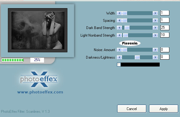 ![]() Attiva il livello raster 2 (il tube di Yoka). Attiva lo strumento Gomma , con i seguenti settaggi:![]() Cancella dalle braccia della donna i segni del tube: ![]() Immagine>Aggiungi bordatura, 1 pixel, simmetriche, con il colore #000000. Immagine>Aggiungi bordatura, 2 pixels, simmetriche, con il colore #6b6b6b. Immagine>Aggiungi bordatura, 1 pixel, simmetriche, con il colore #000000. Immagine>Aggiungi bordatura, 35 pixels, simmetriche, con il colore bianco. Seleziona il bordo con la bacchetta magica ![]() ![]() Riempi la selezione con il colore di sfondo.per riempire con il colore di sfondo, devi cliccare con il tasto destro del mouse. Effetti>Plugins>PhotoEffex - Scanlines: ![]() Effetti>Plugins>Bordermania - Frame #1: ![]() Selezione>Nessuna selezione. Apri il file con il testo "Desperate" e vai a Modifica>Copia. Torna al tuo lavoro e vai a Modifica>Incolla>Incolla come nuovo livello. Aggiungi, se vuoi, su un nuovo livello, il tuo nome e/o il tuo watermark. Livelli>Unisci>Unisci tutto. Salva in formato jpg. ![]() Se hai problemi o dubbi, o trovi un link non funzionante, o anche soltanto per dirmi che ti è piaciuto, scrivimi ![]() 24 Settembre 2007 Le mie traduzioni sono regolarmente registrate |