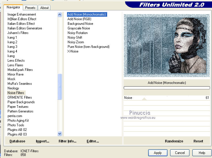 Effetti>Plugins>Filters Unlimited 2.0 - Noise Filters - Add Noise (monochromatic).