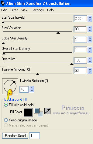 Effetti>Plugins>Alien Skin Xenofex 2.0 - Constellation, clicca una volta su Random Seed e ok.