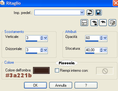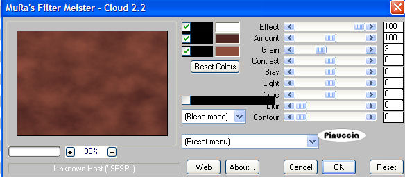qui puoi trovare qualche risposta ai tuoi dubbi. Se l'argomento che ti interessa non è presente, ti prego di segnalarmelo. Questo tutorial è stato scritto in PSP 9, ma può essere eseguito con qualsiasi versione del programma. Per tradurlo, l'ho eseguito con PSP X. Occorrente: Materiale qui Se vuoi condividere i tubes, per favore rispetta il lavoro degli autori, e lascia intatto il livello del watermark. Filtri: Xero qui Mura's Meister qui Apri una nuova immagine trasparente 650 x 450 pixels. Imposta il colore di primo piano con #502722, e il colore di sfondo con #8d4d3c. Effetti>Plugins>Mura's Meister - Cloud: ![]() Apri il tube Kara 1807 e vai a Modifica>Copia. Torna al tuo lavoro e vai a Modifica>Incolla>Incolla come nuovo livello. Sposta il tube nell'angolo in basso a sinistra.Abbassa l'opacità di questo livello al 48%. ![]() Apri il tube "Fall season_misted chichi" e vai a Modifica>Copia. Torna al tuo lavoro e vai a Modifica>Incolla>Incolla come nuovo livello. Spostalo in alto a destra.Cambia la modalità di miscelatura di questo livello in Sovrapponi, e abbassa l'opacità al 60%. ![]() Apri il tube "Misted Scenery 295R e vai a Modifica>Copia. Torna al tuo lavoro e vai a Modifica>Incolla>Incolla come nuovo livello. Spostalo in alto a sinistra.![]() Apri il tube mc 2197 e vai a Modifica>Copia. Torna al tuo lavoro e vai a Modifica>Incolla come nuovo livello. Immagine>Ridimensiona, al 95%, tutti i livelli non selezionato: ![]() Regola>Correzione fotografica>Rimozione disturbo fotocamera digitale. Se sai usando PSP X: Regola>Rimozione disturbo fotocamera digitale. Sposta il tube in basso a destra.![]() Livelli>Unisci>Unisci tutto. Effetti>Plugins>Xero - Porcelain: ![]() Selezione>Seleziona tutto. Effetti>Effetti 3D>Ritaglio: ![]() Selezione>Nessuna selezione. Immagine>Aggiungi bordatura, 1 pixel, simmetriche, con il colore #8d4d3c. Immagine>Aggiungi bordatura, 3 pixels, simmetriche, con il colore #502722. Immagine>Aggiungi bordatura, 1 pixel, simmetriche, con il colore #8d4d3c.. Immagine>Aggiungi bordatura, 30 pixels, simmetriche, con il colore bianco. Seleziona il bordo con la bacchetta magica ,(tolleranza 0, antialias, interno). Effetti>Plugins>Mura's Meister, Cloud (i settaggi sono già correttamente impostati). Selezione>Nessuna selezione. Immagine>Aggiungi bordatura, 1 pixel, simmetriche, con il colore #8d4d3c. Immagine>Aggiungi bordatura, 3 pixels, simmetriche, con il colore #502722. Immagine>Aggiungi bordatura, 1 pixel, simmetriche, con il colore #8d4d3c.. Apri il testo Dreaming of the past e vai a Modifica>Copia. Torna al tuo lavoro e vai a Modifica>Incolla>Incolla come nuovo livello. Posizionalo come preferisci.Aggiungi il tuo nome o il tuo watermark in un nuovo livello. Livelli>Unisci>Unisci tutto. Salva in formato jpg. ![]() Se hai problemi o dubbi, o trovi un link non funzionante, o anche soltanto per dirmi che ti è piaciuto, scrivimi 14 Marzo 2007 |