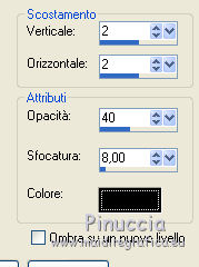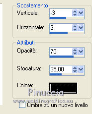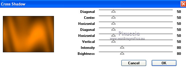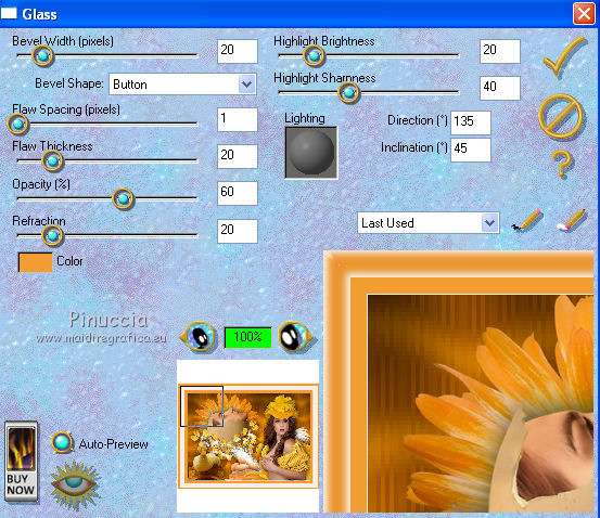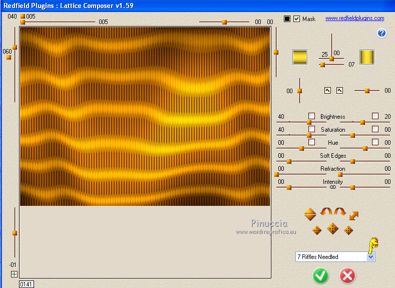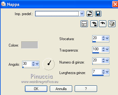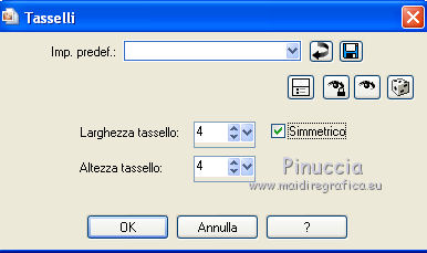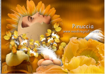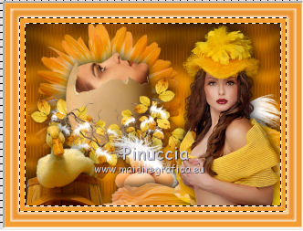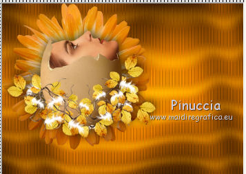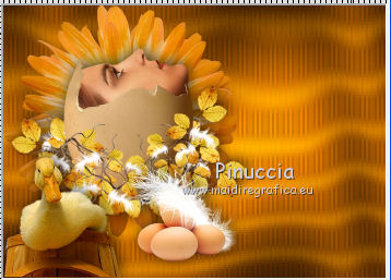 qui puoi trovare qualche risposta ai tuoi dubbi. Se l'argomento che ti interessa non è presente, ti prego di segnalarmelo. Questo tutorial è stato scritto con PSP 9. Per tradurlo, ho usato PSP X. Occorrente: Materiale qui I tubes usati sono di Yoka, Mou, Jet, Patries, Nikita, Marif e Nightangel. (in questa pagina trovi i links ai loro siti). Se vuoi condividere i tubes, per favore rispetta il lavoro degli autori, e lascia intatto il livello del watermark. Filtri Graphics Plus - Cross Shadow qui Eye Candy 3.1 qui Redfield qui ![]() Imposta il colore di primo piano con #af5b00, e il colore di sfondo con #f29d32. Apri una nuova immagine trasparente 700 x 500 pixels, e riempila con il colore di primo piano.Effetti>Plugins>Graphics Plus - Cross Shadow. ![]() Livelli>Duplica. Effetti>Plugins>Redfield - Lattice Composer seleziona 7Riffles Needled e ok. ![]() Effetti>Effetti di distorsione>Tasselli. ![]() Abbassa l'opacità di questo livello al 44%. Apri il tube 1Patries_BL103-margriet e vai a Modifica>Copia. Torna al tuo lavoro e vai a Modifica>Incolla come nuovo livello. Immagine>Ridimensiona, all'80%, tutti i livelli non selezionato. ![]() Sposta il tube in alto a sinistra.Effetti>Effetti 3D>Sfalsa ombra. ![]() Apri il tube jet-womaninegg e vai a Modifica>Copia. Torna al tuo lavoro e vai a Modifica>Incolla come nuovo livello. Immagine>Ridimensiona, all'85%, tutti i livelli non selezionato. Spostalo sul fiore.![]() Effetti>Effetti 3D>Sfalsa ombra, con i settaggi precedenti. Apri il tube 12283242530_divers_nikita e vai a Modifica>Copia. Torna al tuo lavoro e vai a Modifica>Incolla come nuovo livello. Immagine>Rifletti. Immagine>Ridimensiona, al 50%, tutti i livelli non selezionato. Spostalo in basso, sotto il tube.Effetti>Effetti 3D>Sfalsa ombra, con i settaggi precedenti. Apri il tube mou_cute duck e vai a Modifica>Copia. Torna al tuo lavoro e vai a Modifica>Incolla come nuovo livello. Immagine>Ridimensiona, al 75%, tutti i livelli non selezionato. Regola>Messa a fuoco>Metti a fuoco. Sposta il tube in basso a sinistra.![]() Effetti>Effetti 3D>Sfalsa ombra, con i settaggi precedenti. Apri il tube Marif_2007_decor014 e vai a Modifica>Copia. Torna al tuo lavoro e vai a Modifica>Incolla come nuovo livello. Immagine>Rifletti. Spostalo in basso a destra.![]() Effetti>Effetti 3D>Sfalsa ombra, con i settaggi precedenti. Apri il tube A_Yellow_flower e vai a Modifica>Copia. Torna al tuo lavoro e vai a Modifica>Incolla come nuovo livello. Sposta anche questo tube in basso a destra.![]() Effetti>Effetti 3D>Sfalsa ombra, con i settaggi precedenti. Apri il tube Yoka-Photos-Ladies-Geel e vai a Modifica>Copia. Torna al tuo lavoro e vai a Modifica>Incolla come nuovo livello. Immagine>Ridimensiona, al 70%, tutti i livelli non selezionato. Regola>Messa a fuoco>Metti a fuoco. Spostalo a destra.![]() Effetti>Effetti 3D>Sfalsa ombra, con i settaggi precedenti. Immagine>Aggiungi bordatura, 1 pixel, simmetriche, con il colore di #f8f0e6. Immagine>Aggiungi bordatura, 15 pixels, simmetriche, con il colore #f29d32. Immagine>Aggiungi bordatura, 25 pixels, simmetriche, con il colore #f8f0e6. Immagine>Aggiungi bordatura, 15 pixels, simmetriche, con il colore #f29d32. Immagine>Aggiungi bordatura, 1 pixel, simmetriche, con il colore #f8f0e6. Seleziona il bordo chiaro con la bacchetta magica ![]() ![]() Effetti>Plugins>Eye Candy 3.1 - Glass. ![]() Selezione>Deseleziona. Seleziona il bordo giallo con la bacchetta magica ![]() ![]() Effetti>Effetti di trama>Nappa. ![]() Mantieni selezionato. Livelli>Nuovo livello raster. Riempi con il colore di sfondo.Abbassa l'opacità di questo livello al 70%. Selezione>Seleziona tutto. Selezione>Modifica>Contrai - 55 pixels. Effetti>Effetti 3D>Sfalsa ombra. ![]() Ripeti l'Effetto Sfalsa ombra, cambiando verticale e orizzontale con -2. Selezione>Deseleziona. Aggiungi il tuo nome e/o il tuo watermark su un nuovo livello. Livelli>Unisci>Unisci tutto e salva in formato jpg. ![]() Se hai problemi o dubbi, o trovi un link non funzionante, o anche soltanto per dirmi che ti è piaciuto, scrivimi 24 Marzo 2012 |