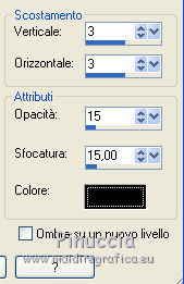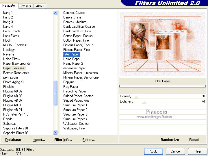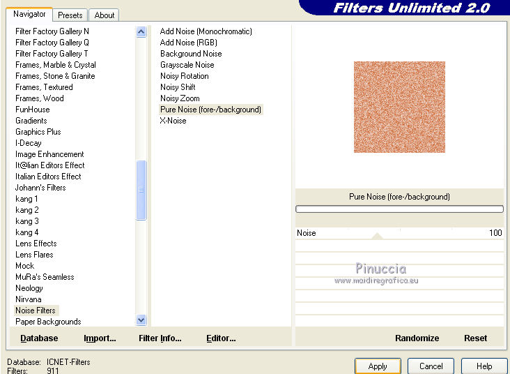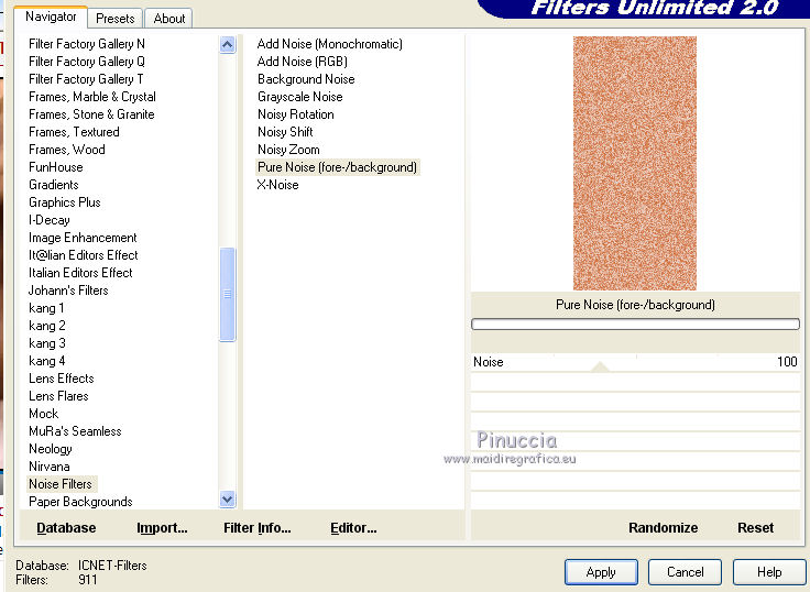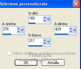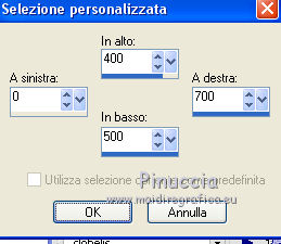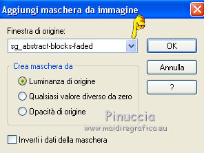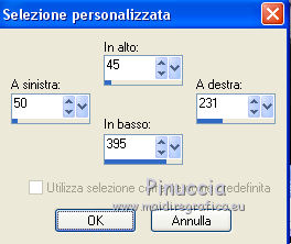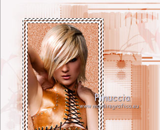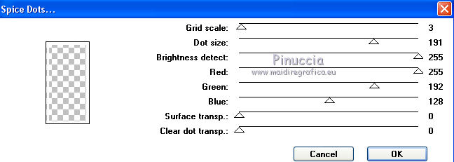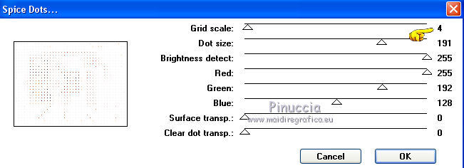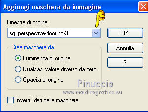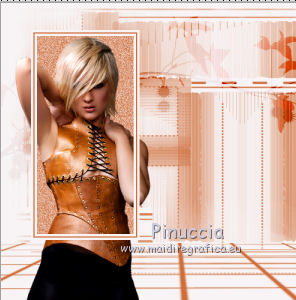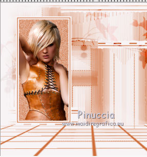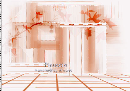 qui puoi trovare qualche risposta ai tuoi dubbi. Se l'argomento che ti interessa non è presente, ti prego di segnalarmelo. Questo tutorial è stato scritto con PSP 9. Dalla versione X4, il comando Immagine>Rifletti è stato sostituito con Immagine>Capovolgi in orizzontale, e il comando Immagine>Capovolgi con Immagine>Capovolgi in verticale. Nelle versioni X5 e X6, le funzioni sono state migliorate rendendo disponibile il menu Oggetti. Vedi la scheda sull'argomento qui Per tradurre questo tutorial ho usato PSP X. Occorrente: Materiale qui Per i tubes grazie Syl e Claudia. Per le maschere grazie EssexGirl. (in questa pagina trovi i links ai loro siti). Se vuoi condividere i tubes, per favore rispetta il lavoro degli autori, e lascia intatto il livello del watermark. Filtri: in caso di dubbi, ricorda di consultare la mia sezione filtri qui Unplugged Tools qui Filters Unlimited 2.0 qui I filtri Unplugged Tools si possono usare da soli o importati in Filters Unlimited (come fare vedi qui) Se un filtro fornito appare con questa icona ![]() Apri le maschere in PSP e minimizzale con il resto del materiale. Imposta il colore di primo piano con #f7f3f4, e il colore di sfondo con #cf6d39. Apri una nuova immagine trasparente 700 x 500 pixels, e riempila con il colore di primo piano.Livelli>Nuovo livello raster. Riempi con il colore di sfondo.Livelli>Nuovo livello maschera>Da immagine. Apri il menu sotto la finestra di origine e vedrai la lista dei files aperti. Seleziona la maschera sg_abstract-block-faded, con i seguenti settaggi. ![]() Livelli>Unisci>Unisci gruppo. Sposta la maschera a 20 pixels dal bordo superiore.(se non visualizzi i Righelli, vai a Visualizza>Righelli). ![]() Apri il tube claudiaviza-flores159-1, e vai a Modifica>Copia. Torna al tuo lavoro e vai a Modifica>Incolla come nuovo livello. Immagine>Ridimensiona, al 75%, tutti i livelli non selezionato. ![]() Sposta il tube in alto a sinistra.Cambia la modalità di miscelatura di questo livello in Sovrapponi. Livelli>Nuovo livello raster. Attiva lo strumento Selezione ![]() clicca sull'icona Selezione personalizzata ![]() e imposta i seguenti settaggi. ![]() Riempi la selezione con il colore di sfondo.Livelli>Nuovo livello maschera>Da immagine. Apri il menu sotto la finestra di origine e seleziona la maschera sg_perspective-flooring-3, con i seguenti settaggi. ![]() Livlli>Unisci>Unisci gruppo. Selezione>Deseleziona. Dovresti avere questo. ![]() Selezione personalizzata ![]() ![]() Riempi con il colore di primo piano.Selezione>Modifica>Contrai - 4 pixels. Riempi con il colore di sfondo.Selezione>Modifica>Contrai - 2 pixels. Riempi con il colore di primo piano.Selezione>Modifica>Contrai - 4 pixels. Premi sulla tastiera il tasto CANC ![]() Mantieni selezionato. Livelli>Nuovo livello raster. Riempi con il colore di sfondo.Effetti>Plugins>Filters Unlimited 2.0 - Noise Filters - Pure Noise (fore-/background). ![]() Selezione>Deseleziona. Livelli>Disponi>Sposta giù, e rimani su questo livello. Apri il tube SvB (274) Beauty e vai a Modifica>Copia. Torna al tuo lavoro e vai a Modifica>Incolla come nuovo livello. Immagine>Ridimensiona, al 75%, tutti i livelli non selezionato. Posiziona il tube nel quadro.![]() Attiva lo strumento Gomma , con i seguenti settaggi,![]() e cancella la parte del tube all'esterno della cornice. ![]() Regola>Messa a fuoco>Maschera di contrasto. ![]() Attiva il livello superiore. Attiva lo strumento Bacchetta magica ![]() ![]() e clicca nei due bordi chiari per selezionarli. ![]() Effetti>Plugins>Unplugged Tools - Spice Dots. ![]() Effetti>Effetti di bordo>Aumenta di più. Selezione>Deseleziona. Livelli>Unisci>Unisci giù - 2 volte. Effetti>Effetti 3D>Sfalsa ombra. ![]() Ripeti l'Effetto Sfalsa ombra, cambiando verticale e orizzontale con -2. Livelli>Nuovo livello raster. Selezione personalizzata ![]() ![]() Riempi con il colore di primo piano.Selezione>Modifica>Contrai - 4 pixels. Riempi con il colore di sfondo.Selezione>Modifica>Contrai - 2 pixels. Riempi con il colore di primo piano.Selezione>Modifica>Contrai - 4 pixels. Premi sulla tastiera il tasto CANC ![]() Mantieni selezionato. Livelli>Nuovo livello raster. Riempi con il colore di sfondo.Effetti>Plugins>Filters Unlimited 2.0 - Noise Filters - Pure Noise (fore-/background), con i settaggi precedenti (dovrai reimpostare, perché Unlimited non tiene in memoria i settaggi). ![]() Selezione>Deseleziona. Livelli>Disponi>Sposta giù, e rimani su questo livello. Apri il tube SvB (275) Beauty e vai a Modifica>Copia. Torna al tuo lavoro e vai a Modifica>Incolla come nuovo livello. Immagine>Rifletti. Immagine>Ridimensiona, al 50%, tutti i livelli non selezionato. Posiziona il tube nel piccolo quadro.![]() Attiva lo strumento Gomma , con i settaggi precedenti,e cancella la parte del tube all'esterno della cornice. Regola>Messa a fuoco>Maschera di contrasto, con i settaggi precedenti. ![]() Attiva il livello superiore. Attiva lo strumento Bacchetta magica ![]() e clicca nei due bordi chiari per selezionarli. Effetti>Plugins>Unplugged Tools - Spice Dots, con i settaggi precedenti. Effetti>Effetti di bordo>Aumenta di più. Selezione>Deseleziona. Livelli>Unisci>Unisci giù - 2 volte. Effetti>Effetti 3D>Sfalsa ombra. ![]() Ripeti l'Effetto Sfalsa ombra, cambiando verticale e orizzontale con -2. Immagine>Aggiungi bordatura, 2 pixels, simmetriche, con il colore #cf6d39. Immagine>Aggiungi bordatura, 40 pixels, simmetriche, con il colore #f7f3f4. Immagine>Aggiungi bordatura, 5 pixels, simmetriche, con il colore #cf6d39. Seleziona il bordo da 40 pixels con la bacchetta magica ![]() Effetti>Plugins>Filters Unlimited 2.0 - Paper Textures - Filter Paper. ![]() Livelli>Nuovo livello raster. Riempi con il colore di sfondo.Cambia la modalità di miscelatura di questo livello in luce diffusa. Selezione>Deseleziona. Attiva il livello di sfondo. Seleziona il bordo da 5 pixels con la bacchetta magica ![]() Effetti>Plugins>Unplugged Tools - Spice Dots. ![]() Selezione>Seleziona tutto. Selez