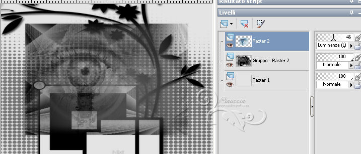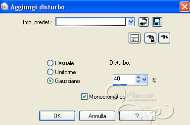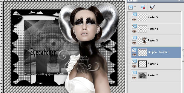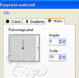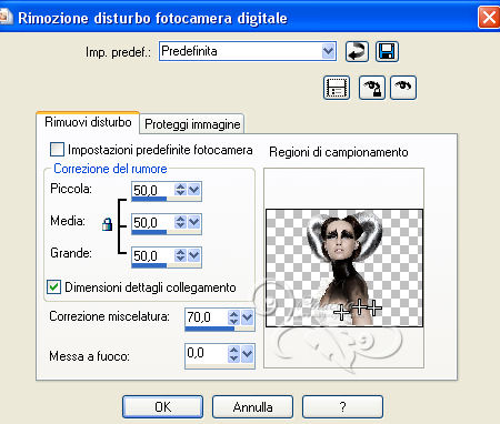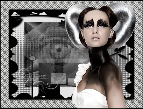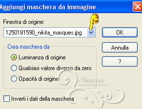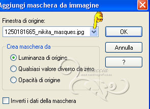 qui puoi trovare qualche risposta ai tuoi dubbi. Se l'argomento che ti interessa non è presente, ti prego di segnalarmelo. Questo tutorial è stato scritto con PSP 9. Per tradurlo, ho usato PSP X. Occorrente: Materiale qui I tubes sono di Kitty e Gina. Le maschere di Nikita. (in questa pagina trovi i links ai loro siti). Se vuoi condividere i tubes, per favore rispetta il lavoro degli autori, e lascia intatto il livello del watermark. Animation Shop qui ![]() Apri le maschere e il motivo "ruitvormige plaat" in PSP e minimizzali con il resto del materiale. Imposta il colore di primo piano con #e4e4e5, e il colore di sfondo con #000000. Apri una nuova immagine trasparente 700 x 500 pixels, e riempila con il colore di primo piano.Livelli>Nuovo livello raster. Riempi con il colore di sfondo.Livelli>Nuovo livello maschera>Da immagine. Apri il menu sotto la finestra di origine e vedrai la lista dei files aperti. Seleziona la maschera 1250181665_nikita_masques, con i seguenti settaggi: ![]() Livelli>Unisci>Unisci gruppo. Apri il tube Gina Misted Divers 414 e vai a Modifica>Copia. Torna al tuo lavoro e vai a Modifica>Incolla come nuovo livello. Immagine>Ridimensiona, al 60%, tutti i livelli non selezionato. ![]() Cambia la modalità di miscelatura di questo livello in Luminanza (esistente), e abbassa l'opacità al 46%. ![]() Immagine>Aggiungi bordatura, 5 pixels, simmetriche, con il colore di sfondo #000000. Immagine>Aggiungi bordatura, 50 pixels, simmetriche, con il colore di primo piano #e4e4e5. Immagine>Aggiungi bordatura, 5 pixels, simmetriche, con il colore di sfondo #000000. Attiva lo strumento Bacchetta magica ![]() ![]() Clicca nel bordo da 50 pixels per selezionarlo. Passa il colore di primo piano a Motivi, e nella categoria Immagini aperte, cerca il motivo Ruitvormige plaat. Seleziona il motivo con i seguenti settaggi. ![]() Riempi la selezione con il motivo.Effetti>Effetti di bordo>Aumenta. Livelli>Nuovo livello raster. Riempi con il colore di sfondo.Cambia la modalità di miscelatura di questo livello in Sovrapponi. Mantieni selezionato. Attiva il livello di sfondo. Selezione>Seleziona tutto. Selezione>Modifica>Contrai - 55 pixels. Effetti>Effetti 3D>Sfalsa ombra. ![]() Ripeti l'Effetto Sfalsa ombra, cambiando verticale e orizzontale con -2. Selezione>Deseleziona. Attiva il livello superiore. Livelli>Nuovo livello raster. Riempi con il colore di sfondo.Livelli>Nuovo livello maschera>Da immagine. Apri il menu sotto la finestra di origine e seleziona la maschera 1250181590, con i seguenti settaggi: ![]() Livelli>Unisci>Unisci gruppo. Immagine>Ridimensiona - 700 x 500 pixels, mantieni proporzioni e tutti i livelli non selezionati. ![]() Apri il tube Kittys-angelique e vai a Modifica>Copia. Torna al tuo lavoro e vai a Modifica>Incolla come nuovo livello. Immagine>Ridimensiona, al 90%, tutti i livelli non selezionato. Regola>Rimozione disturbo fotocamera digitale, con i settaggi standard. ![]() Regola>Messa a fuoco>Maschera di contrasto. ![]() Spostalo a destra e un po' più in basso.![]() Effetti>Effetti 3D>Sfalsa ombra. ![]() Apri il file di testo Eyecatcher e vai a Modifica>Copia. Torna al tuo lavoro e vai a Modifica>Incolla come nuovo livello. Spostalo dove preferisci o vedi il mio esempio.Aggiungi il tuo nome e/o il tuo watermark su un nuovo livello. ***Animazione*** Attiva il livello della seconda maschera. ![]() Regola>Aggiungi/Rimuovi disturbo>Aggiungi disturbo. ![]() Modifica>Copia Unione. Apri Animation Shop e vai a Modifica>Incolla>Incolla come nuova animazione. Torna in PSP. Modifica>Annulla azione Aggiungi disturbo. Regola>Aggiungi/Rimuovi disturbo>Aggiungi disturbo, e porta il disturbo a 50. Modifica>Copia Unione. Torna in Animation Shop e vai a Modifica>Incolla>Incolla dopo il fotogramma corrente. Di nuovo in PSP. Modifica>Annulla azione Aggiungi disturbo. Regola>Aggiungi/Rimuovi disturbo/Aggiungi disturbo, e porta il disturbo a 60. Modifica>Copia Unione. In Animation Shop: Modifica>Incolla>Incolla dopo il fotogramma corrente. Ancora in PSP. Modifica>Annulla azione Aggiungi disturbo. Regola>Aggiungi/Rimuovi disturbo/Aggiungi disturbo, imposta il disturbo nuovamente a 50. Modifica>Copia Unione. In Animation Shop: Modifica>Incolla>Incolla dopo il fotogramma corrente. E avrai una animazione composta da 4 fotogrammi. Modifica>Seleziona tutto. Animazione>Proprietà fotogrammi e imposta la velocità a 22. Controlla il risultato cliccando su Visualizza ![]() e salva in formato gif. ![]() Se hai problemi o dubbi, o trovi un link non funzionante, o anche soltanto per dirmi che ti è piaciuto, scrivimi 10 Agosto 2013 |