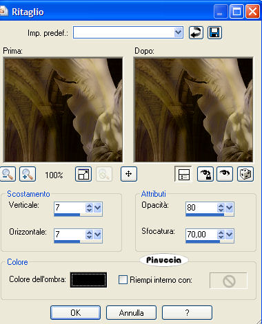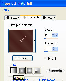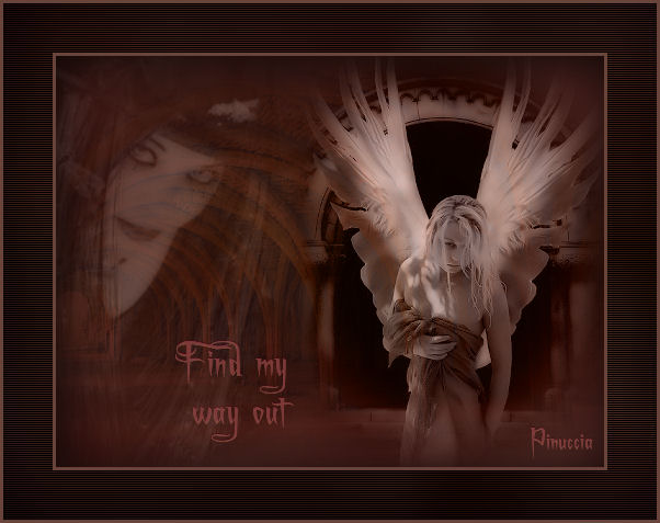 qui puoi trovare qualche risposta ai tuoi dubbi. Se l'argomento che ti interessa non è presente, ti prego di segnalarmelo. Questo tutorial è stato scritto in PSP 9, ma può essere eseguito con qualsiasi versione del programma. Occorrente: Materiale qui Per favore, se condividi i tubes, rispetta il lavoro degli autori e mantieni intatto il livello del watermark. Filtri: FM Tile Tools qui Xero qui Jeux de lignes qui Apri una nuova immagine trasparente 500 x 375 pixels. Imposta il colore di primo piano con # 481e1b, e il colore di sfondo con # 522e29. Passa il colore di primo piano a Gradiente di primo piano/sfondo, lineare, con i seguenti settaggi: ![]() Riempi l'immagine con questo gradiente.Regola>Sfocatura>Sfocatura gaussiana, raggio 30. ![]() Apri il tube hjr_misted_arches e vai a Modifica>Copia. Torna al tuo lavoro e vai a Modifica>Incolla>Incolla come nuovo livello. Cambia la modalità di miscelatura di questo livello in Sovrapponi e abbassa l'opacità al 50%. Effetti>Plugins>FM Tile Tools - Blend Emboss, con i settaggi standard. ![]() Apri il tube SS_361. Immagine>Ridimensiona, al 70%, tutti i livelli selezionato. Modifica>Copia. Torna al tuo lavoro e vai a Modifica>Incolla>Incolla come nuovo livello. Spostalo a destra.Cambia la modalità di miscelatura di questo livello in Luminanza (Esistente) e abbassa l'opacità all'84%. Apri il tube SS_697. Immagine>Ridimensiona, all'80%, tutti i livelli selezionato. Modifica>Copia. Torna al tuo lavoro e vai a Modifica>Incolla>Incolla come nuovo livello. Spostalo a sinistra.Cambia la modalità di miscelatura di questo livello in Luminanza (esistente) e abbassa l'opacità al 28%. Livelli>Unisci>Unisci tutto. Effetti>Plugins>Xero - Porcelain: ![]() Selezione>Seleziona tutto. Effetti>Effetti 3D>Ritaglio: ![]() Selezione>Nessuna selezione. Modifica>Copia. Immagine>Aggiungi bordatura, 3 pixels, simmetriche, con il colore #68443a. Immagine>Aggiungi bordatura, 45 pixels, simmetriche, con il colore bianco. Seleziona il bordo con la bacchetta magica ![]() Modifica>Incolla>Incolla nella selezione. Regola>Sfocatura>Sfocatura gaussiana, raggio 15. ![]() Immagine>Capovolgi. Effetti>Plugins>Jeux de lignes - Entrelacement, con i settaggi standard. ![]() Selezione>Nessuna selezione. Immagine>Aggiungi bordatura, 3 pixels, simmetriche, con il colore #68443a. Attiva lo strumento Testo , mobile.Chiudi il colore di primo piano e imposta il colore di sfondo con #522e26. Scegli un font (io ho usato A Charming Font Expanded, dimensione 36) e scrivi "Find my way out" o in italiano "Scopro (o cerco) la mia strada", o quello che vuoi). Se stai usando PSP X, dovrai regolare la dimensione, perchè i settaggi di questa versione in pixels non corrispondono a quelli delle precedenti versioni. Vedi qui Selezione>Innalza selezione a livello. Selezione>Nessuna selezione. Cambia la modalità di miscelatura di questo livello in Filtra. Effetti>Effetti 3D>Sfalsa ombra, con i seguenti settaggi, colore nero, ombra su un nuovo livello selezionato: ![]() Se vuoi aggiungi il tuo nome o il tuo watermark in un nuovo livello. Livelli>Unisci>Unisci tutto. Salva in formato jpg. ![]() Se hai problemi o dubbi, o trovi un link non funzionante, o anche soltanto per dirmi che ti è piaciuto, scrivimi Gennaio 2007 |