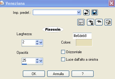 selezione con il colore di primo piano.Selezione>Nessuna selezione. Immagine>Aggiungi bordatura, 1 pixel, simmetriche, con il colore #764a48. Immagine>Aggiungi bordatura, 25 pixels, simmetriche, con il colore nero. Seleziona questo bordo con la bacchetta magica ![]() Effetti>Effetti di trama>Veneziana: ![]() Selezione>Nessuna selezione. Immagine>Aggiungi bordatura, 1 pixel, simmetriche, con il colore #e6deb8. Apri il file con il testo Forbidden fruits, e vai a Modifica>Copia. Torna al tuo lavoro e vai a Modifica>Incolla come nuovo livello. Posiziona