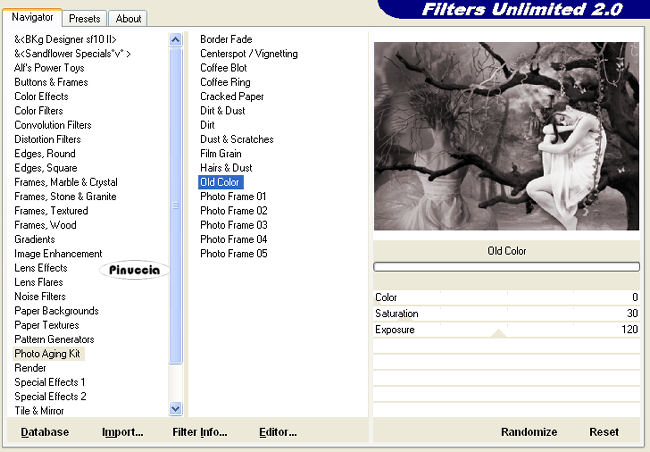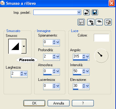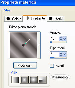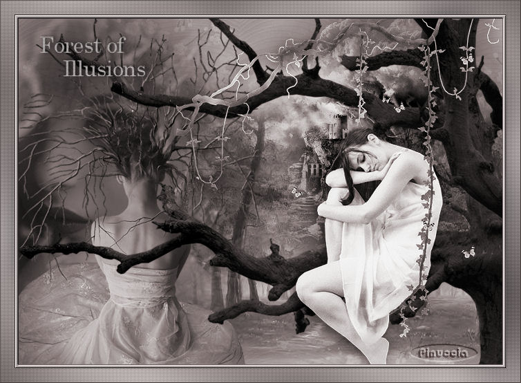 qui puoi trovare qualche risposta ai tuoi dubbi. Se l'argomento che ti interessa non è presente, ti prego di segnalarmelo. Questo tutorial è stato scritto in PSP 9, ma può essere eseguito con qualsiasi versione del programma. Occorrente: Materiale qui I tubes usati per questo tutorial sono di Thaiss, Lamanouche, Brigitte, Silke e Monique. Se vuoi condividere i tubes, per favore rispetta il lavoro degli autori, e lascia intatto il livello del watermark. (in questa pagina trovi i links ai siti dei creatori di tubes) Filtri: Penta.com qui Filters Unlimited 2.0 qui Photo Aging Kit qui I filtri Photo Aging Kit si usano importandoli in Filters Unlimited. Come fare vedi qui Apri una nuova immagine trasparente 700 x 500 pixels. Imposta il colore di primo piano con #766e69, e il colore di sfondo con #b2aaaa. Riempi l'immagine trasparente con il colore di primo piano.Apri il motivo Bg Blossem e minimizzalo nella tua area di lavoro. Passa il colore di primo piano a Motivi e seleziona Bg Blossem, con i seguenti settaggi: ![]() Livelli>Nuovo livello raster. Riempi il livello con questo motivo.Cambia la modalità di miscelatura di questo livello in Luminanza (esistente), e abbassa l'opacità al 70%. Apri il tube Tubes_by_monique42_3564, e vai a Modifica>Copia. Torna al tuo lavoro e vai a Modifica>Incolla>Incolla come nuovo livello. Spostalo in alto a destra.(vedi il mio esempio). Cambia la modalità di miscelatura di questo livello in Luminanza (esistente). Apri il tube dark_forest_path, e vai a Modifica>Copia. Torna al tuo lavoro e vai a Modifica>Incolla>Incolla come nuovo livello. Spostalo in basso a destra.Cambia la modalità di miscelatura di questo livello in Luminanza (esistente), e abbassa l'opacità al 70%. ![]() Apri il tube Thaïss, e vai a Modifica>Copia. Torna al tuo lavoro e vai a Modifica>Incolla>Incolla come nuovo livello. Spostalo a sinistra, e un po' più in basso.Cambia la modalità di miscelatura di questo livello in Luminanza (esistente), e abbassa l'opacità al 90%. Apri il Mtm_Lady_252Fan, e vai a Modifica>Copia. Torna al tuo lavoro e vai a Modifica>Incolla>Incolla come nuovo livello. Immagine>Rifletti. Immagine>Ridimensiona, al 90%, tutti i livelli non selezionato. ![]() Spostalo nell'angolo in basso a sinistra.Cambia la modalità di miscelatura di questo livello in Luminanza (esistente). ![]() Apri il tube Mtm_bomen27_9jan2008, e vai a Modifica>Copia. Torna al tuo lavoro e vai a Modifica>Incolla>Incolla come nuovo livello. Regola>Saturazione e tonalità>Viraggio: ![]() Apri il tube Mtm_Lady_133_DansLaLune, e vai a Modifica>Copia. Torna al tuo lavoro e vai a Modifica>Incolla>Incolla come nuovo livello. Immagine>Rifletti. Immagine>Ridimensiona, all'85%, tutti i livelli non selezionato. Regola>Messa a fuoco>Metti a fuoco. Spostalo a destra, un po' più in alto.Effetti>Effetti 3D>Sfalsa ombra: ![]() Cambia la modalità di miscelatura di questo livello in Luminanza (esistente). Livelli>Unisci>Unisci tutto. Effetti>Plugins>Filters Unlimited - Photo Aging Kit - Old Color: ![]() Immagine>Aggiungi bordatura, 1 pixel, simmetriche, con il colore #514848. Immagine>Aggiungi bordatura, 4 pixels, simmetriche, con il colore bianco. Seleziona il bordo con la bacchetta magica ![]() ![]() Riempi la selezione con il colore di sfondo.Effetti>Effetti 3D>Smusso a rilievo: ![]() Selezione>Nessuna selezione. Immagine>Aggiungi bordatura, 1 pixel, simmetriche, con il colore #514848. Imposta il colore di primo piano con #514848 (lascia il colore di sfondo come sta). Passa il colore di primo piano a Gradiente: ![]() Immagine>Aggiungi bordatura, 20 pixels, simmetriche, con il colore bianco. Seleziona il bordo con la bacchetta magica ![]() e riempilo con il gradiente.Regola>Sfocatura>Sfocatura gaussiana, raggio 25. ![]() Effetti>Plugins>Penta.com - Color dot, con i settaggi standard. ![]() Selezione>Nessuna selezione. Immagine>Aggiungi bordatura, 1 pixel, simmetriche, con il colore #514848. Apri il file con il testo Forest of Illusions, e vai a Modifica>Copia. Torna al tuo lavoro e vai a Modifica>Incolla>Incolla come nuovo livello, e posiziona il testo come preferisci.Aggiungi il tuo nome e/o il tuo watermark. Livelli>Unisci>Unisci visibile, e salva in formato jpg. ![]() Se hai problemi o dubbi, o trovi un link non funzionante, o anche soltanto per dirmi che ti è piaciuto, scrivimi