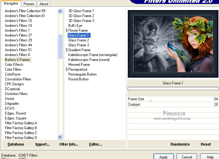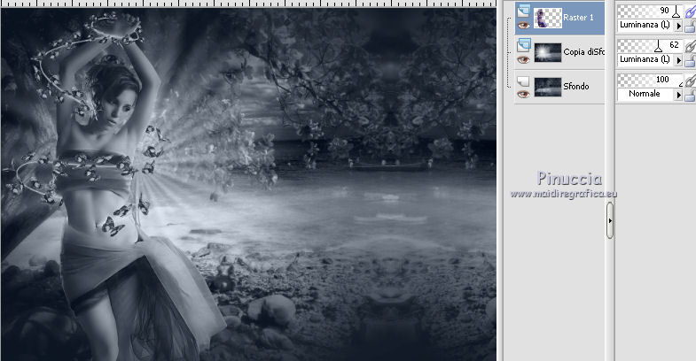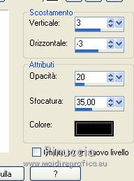 qui puoi trovare qualche risposta ai tuoi dubbi. Se l'argomento che ti interessa non è presente, ti prego di segnalarmelo. Questo tutorial è stato scritto con PSP 9. Dalla versione X4, il comando Immagine>Rifletti è stato sostituito con Immagine>Capovolgi in orizzontale, e il comando Immagine>Capovolgi con Immagine>Capovolgi in verticale. Nelle versioni X5 e X6, le funzioni sono state migliorate rendendo disponibile il menu Oggetti. Vedi la scheda sull'argomento qui Per tradurre questo tutorial ho usato PSP X. Occorrente: Materiale qui Per i tubes grazie Nikita e Claudia. (in questa pagina trovi i links ai loro siti). Se vuoi condividere i tubes, per favore rispetta il lavoro degli autori, e lascia intatto il livello del watermark. Filtri: in caso di dubbi, ricorda di consultare la mia sezione filtri qui Filters Unlimited 2.0 qui VM Natural - Starmaker qui Photo Aging Kit - Centerspot/Vignetting (da importare in Unlimited) qui Alien Skin Xenofex 2 - Constellationqui I filtri VM Natural si possono usare da soli o importati in Filters Unlimited (come fare vedi qui) Se un filtro fornito appare con questa icona ![]() 1. Imposta il colore di primo piano con #1a222e. Apri una nuova immagine trasparente 700 x 500 pixels, e riempila con il colore di primo piano.2. Apri il tube claudiaviza-paisaje258, e vai a Modifica>Copia. Torna al tuo lavoro e vai a Modifica>Incolla come nuovo livello. Spostalo a sinistra (vedi l'esempio finale).Cambia la modalità di miscelatura di questo livello in Luminanza (esistente), e abbassa l'opacità all'80%. 3. Livelli>Duplica. Immagine>Rifletti. Posiziona il duplicato a destra.![]() 4. Livelli>Unisci>Unisci tutto. Livelli>Duplica. 5. Effetti>Plugins>VM Natural - Starmaker. ![]() 6. Effetti>Plugins>Filters Unlimited 2.0 - Photo Aging Kit - Centerspot/Vignetting. ![]() 7. Cambia la modalità di miscelatura di questo livello in Luminanza (esistente), e abbassa l'opacità al 62%. 8. Apri il tube claudiaviza-mujer126, e vai a Modifica>Copia. Torna al tuo lavoro e vai a Modifica>Incolla come nuovo livello. Immagine>Ridimensiona, al 65%, tutti i livelli non selezionato. ![]() 9. Regola>Luminosità e contrasto>Luminosità e contrasto. ![]() Regola>Messa a fuoco>Maschera di contrasto. ![]() 10. Sposta il tube a sinistra.Cambia la modalità di miscelatura di questo livello in Luminanza (esistente), e abbassa l'opacità al 90%. ![]() 11. Apri il tube 13458166738_femmes, e vai a Modifica>Copia. Torna al tuo lavoro e vai a Modifica>Incolla come nuovo livello. Immagine>Ridimensiona, al 90%, tutti i livelli non selezionato. Regola>Luminosità e contrasto>Luminosità e contrasto, con i settaggi precedenti. Regola>Messa a fuoco>Maschera di contrasto, con i settaggi precedenti. ![]() Sposta il tube a destra.12. Effetti>Effetti 3D>Sfalsa ombra. ![]() 13. Immagine>Aggiungi bordatura, 1 pixel, simmetriche, con il colore #d4dae2. Immagine>Aggiungi bordatura, 50 pixels, simmetriche, colore #19212d. Immagine>Aggiungi bordatura, 1 pixel, simmetriche, con il colore #d4dae2. 14. Attiva lo strumento Bacchetta magica ![]() ![]() Clicca nel bordo da 50 pixels per selezionarlo. 15. Effetti>Plugins>Alien Skin Xenofex 2 - Constellation. ![]() 16. Effetti>Plugins>Filters Unlimited 2.0 - Buttons & Frames - Glass Frame 1. ![]() Selezione>Deseleziona. 17. Firma il tuo lavoro su un nuovo livello. Livelli>Unisci>Unisci tutto e salva in formato jpg. ![]() Se hai problemi o dubbi, o trovi un link non funzionante, o anche soltanto per dirmi che ti è piaciuto, scrivimi 2 Maggio 2014 |