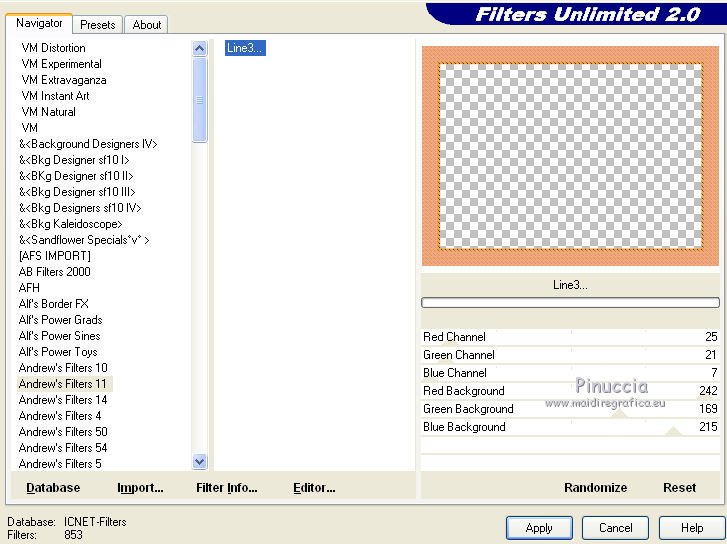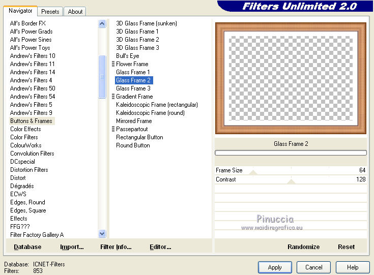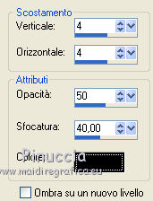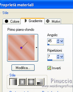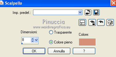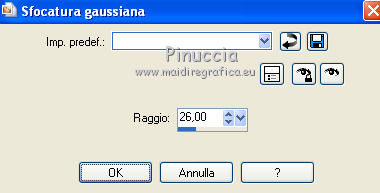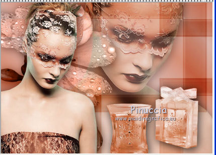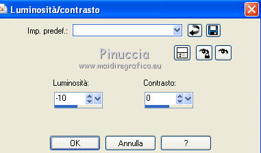 qui puoi trovare qualche risposta ai tuoi dubbi. Se l'argomento che ti interessa non è presente, ti prego di segnalarmelo. Questo tutorial è stato scritto con PSP 9. Per tradurlo, ho usato PSP X. Occorrente: Materiale qui I tubes usati per questo tutorial sono di Guismo, Silke e Gerry. (in questa pagina trovi i links ai loro siti). La cornice è di Adriana. Se vuoi condividere i tubes, per favore rispetta il lavoro degli autori, e lascia intatto il livello del watermark. Filtri: Filters Unlimited 2.0 qui Andrew's Filter 11 qui I filtri Andrews per essere usati devono prima essere convertiti. Come fare vedi qui Si usano importandoli in Filters Unlimited (come fare vedi qui) ma possono funzionare anche da soli ![]() Apri una nuova immagine trasparente 700 x 500 pixels. Imposta il colore di primo piano con #dab6ae, e il colore di sfondo con #d78f77. Passa il colore di primo piano a Gradiente. ![]() Riempi l'immagine trasparente con il gradiente.Apri il tube calguisportrait2089 e vai a Modifica>Copia. non chiuderlo perchè ti servirà ancora Torna al tuo lavoro e vai a Modifica>Incolla come nuovo livello. Spostalo un po' più in basso.![]() Regola>Messa a fuoco>Maschera di contrasto. ![]() Effetti>Effetti 3D>Sfalsa ombra. ![]() Abbassa l'opacità di questo livello al 62%. Apri Frame_FY_AD e vai a Modifica>Copia. Torna al tuo lavoro e vai a Modifica>Incolla come nuovo livello. Spostalo in alto contro il bordo,a circa 20 pixels di distanza dal bordo destro. ![]() Cambia la modalità di miscelatura di questo livello in Luce diffusa. Livelli>Duplica. Effetti>Effetti di immagine>Scostamento. ![]() Apri il tube Gerry_Bloemen13 e vai a Modifica>Copia. Torna al tuo lavoro e vai a Modifica>Incolla come nuovo livello. Immagine>Ridimensiona, all'85%, tutti i livelli non selezionato. ![]() Sposta il tube a sinistra e un po' più in basso.![]() Effetti>Effetti 3D>Sfalsa ombra, con i settaggi precedenti. Cambia la modalità di miscelatura di questo livello in Luminanza (esistente). Apri il tube SKF_gift2810-08 e vai a Modifica>Copia. Torna al tuo lavoro e vai a Modifica>Incolla come nuovo livello. Immagine>Ridimensiona, al 55%, tutti i livelli non selezionato. Regola>Luminosità e contrasto>Luminosità e contrasto. ![]() Spostalo in basso a destra.![]() Effetti>Effetti 3D>Sfalsa ombra, con i settaggi precedenti. Cambia la modalità di miscelatura di questo livello in Luminanza. Attiva nuovamente il tube calguisportrait2089 è vai a Modifica>Copia. Torna al tuo lavoro e vai a Modifica>Incolla come nuovo livello. Immagine>Ridimensiona, al 55%, tutti i livelli non selezionato. Regola>Messa a fuoco>Maschera di contrasto, con i settaggi precedenti. Effetti>Effetti 3D>Sfalsa ombra, con i settaggi precedenti. Sposta questo tube in basso a sinistra.![]() Livelli>Unisci>Unisci tutto. Modifica>Copia. Immagine>Aggiungi bordatura, 2 pixels, simmetriche selezionato, con il colore #a93f24. Immagine>Aggiungi bordatura, 40 pixels, simmetriche, con il colore bianco #ffffff. Seleziona questo bordo con la bacchetta magica ![]() ![]() Modifica>Incolla nella selezione. Regola>Sfocatura>Sfocatura gaussiana - raggio 26. ![]() Livelli>Nuovo livello raster. Riempi con il colore di sfondo.Cambia la modalità di miscelatura di questo livello in Moltiplica. Effetti>Effetti 3D>Scalpello. ![]() Effetti>Plugins>Filters Unlimited 2.0 - Andrews Filters 11 - Line 3. ![]() Effetti>Effetti di bordo>Aumenta. Effetti>Plugins>Filters Unlimited 2.0 - Buttons & Frames - Glass Frame 2. ![]() Selezione>Deseleziona. Immagine>Aggiungi bordatura, 1 pixel, simmetriche, con il colore #6c1b0d. Immagine>Aggiungi bordatura, 15 pixels, simmetriche, con il colore #a93f24. Immagine>Aggiungi bordatura, 1 pixel, simmetriche, con il colore #6c1b0d. Aggiungi il tuo nome e/o il tuo watermark su un nuovo livello. Livelli>Unisci>Unisci tutto e salva in formato jpg. ![]() Se hai problemi o dubbi, o trovi un link non funzionante, o anche soltanto per dirmi che ti è piaciuto, scrivimi 21 Febbraio 2012 |