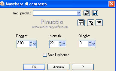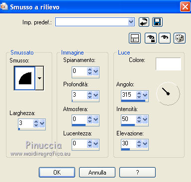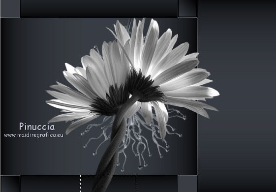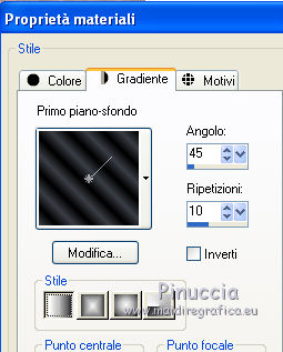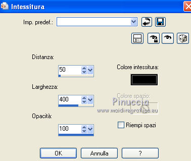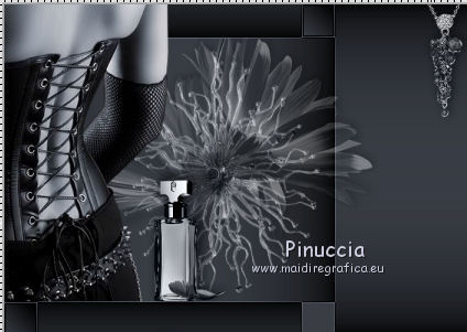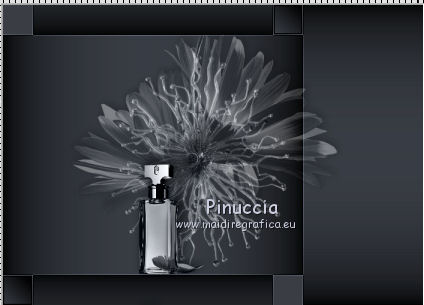 qui puoi trovare qualche risposta ai tuoi dubbi. Se l'argomento che ti interessa non è presente, ti prego di segnalarmelo. Questo tutorial è stato scritto con PSP 9. Per tradurlo, ho usato PSP X. Occorrente: Materiale qui I tubes usati per questo tutorial sono di Patries, Pascale, Jet, Hanne e Mou. Se vuoi condividere i tubes, per favore rispetta il lavoro degli autori, e lascia intatto il livello del watermark. ![]() Apri una nuova immagine trasparente 700 x 500 pixels. Imposta il colore di primo piano con #3a3e45, e il colore di sfondo con il colore nero. Riempi l'immagine trasparente con il colore di primo piano.Effetti>Effetti di trama>Intessitura. ![]() Effetti>Effetti di bordo>Aumenta. Passa il colore di primo piano a Gradiente. ![]() Attiva lo strumento Bacchetta magica ![]() ![]() e clicca sui quadretti come nella schermata: ![]() Riempi la selezione con il gradiente.Livelli>Nuovo livello raster. Riempi con il colore di sfondo.Selezione>Modifica>Contrai - 2 pixels. Premi sulla tastiera il tasto CANC. Selezione>Deseleziona. Apri il tube mou_snaileyechandlier e vai a Modifica>Copia. Torna al tuo lavoro e vai a Modifica>Incolla come nuovo livello. Immagine>Ridimensiona, al 70%, tutti i livelli non selezionato. ![]() Posiziona il tube al centro del riquadro - vedi il mio esempio.Cambia la modalità di miscelatura di questo livello in Luminanza (Esistente), e abbassa l'opacità al 70%. Apri il tube Hanne-Flowers dec2009 e vai a Modifica>Copia. Torna al tuo lavoro e vai a Modifica>Incolla come nuovo livello. Immagine>Ridimensiona, al 70%, tutti i livelli non selezionato. Posiziona il tube sopra il fiore.Attiva lo strumento Gomma e cancella lo stelo al di fuori del riquadro.![]() Effetti>Effetti 3D>Sfalsa ombra. ![]() Cambia la modalità di miscelatura di questo livello in Luce netta, e abbassa l'opacità al 40%. Apri il tube jet-parfum-mei e vai a Modifica>Copia. Torna al tuo lavoro e vai a Modifica>Incolla come nuovo livello. Immagine>Ridimensiona, al 35%, tutti i livelli non selezionato. Spostalo come nel mio esempio.![]() Effetti>Effetti 3D>Sfalsa ombra, con i settaggi precedenti. Cambia la modalità di miscelatura di questo livello in Luminanza (Esistente). Apri il tube mou_necklace2 e vai a Modifica>Copia. Torna al tuo lavoro e vai a Modifica>Incolla come nuovo livello. Immagine>Ridimensiona, al 65%, tutti i livelli non selezionato. Regola>Messa a fuoco>Maschera di contrasto. ![]() Spostalo nell'angolo in alto a destra.Effetti>Effetti 3D>Sfalsa ombra, con i settaggi precedenti. Cambia la modalità di miscelatura di questo livello in Luminanza (Esistente). Apri il tube 1Patries_BP20 e vai a Modifica>Copia. Torna al tuo lavoro e vai a Modifica>Incolla come nuovo livello. Immagine>Ridimensiona, al 110%, tutti i livelli non selezionato. Spostalo in basso a sinistra, contro il bordo chiaro.![]() Effetti>Effetti 3D>Sfalsa ombra, con i settaggi precedenti. Abbassa l'opacità di questo livello al 40%. Apri il tube Pascale_Photos_Woman e vai a Modifica>Copia. Torna al tuo lavoro e vai a Modifica>Incolla come nuovo livello. Immagine>Ridimensiona, al 55%, tutti i livelli non selezionato. Spostalo in basso a destra.Regola>Messa a fuoco>Maschera di contrasto, con i settaggi precedenti. Effetti>Effetti 3D>Sfalsa ombra, con i settaggi precedenti. Immagine>Aggiungi bordatura, 1 pixel, simmetriche, con il colore nero. Immagine>Aggiungi bordatura, 20 pixels, simmetriche, con il colore 3a3e45. Immagine>Aggiungi bordatura, 10 pixel, simmetriche, con il colore nero. Immagine>Aggiungi bordatura, 20 pixels, simmetriche, con il colore #3a3e45. Immagine>Aggiungi bordatura, 1 pixel, simmetriche, con il colore nero. Seleziona il bordo nero da 10 pixels con la bacchetta magica ![]() Effetti>Effetti 3D>Smusso a rilievo. ![]() Selezione>Deseleziona. Apri il file di testo Glamour e vai a Modifica>Copia. Torna al tuo lavoro e vai a Modifica>Incolla come nuovo livello. Spostalo in basso, come nel mio esempio.Aggiungi il tuo nome e/o il tuo watermark su un nuovo livello. Livelli>Unisci>Unisci tutto e salva in formato jpg. ![]() Se hai problemi o dubbi, o trovi un link non funzionante, o anche soltanto per dirmi che ti è piaciuto, scrivimi 18 Gennaio 2012 |