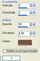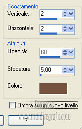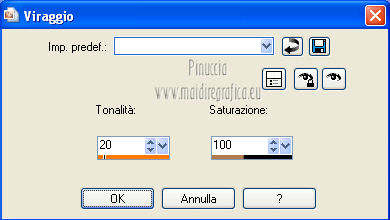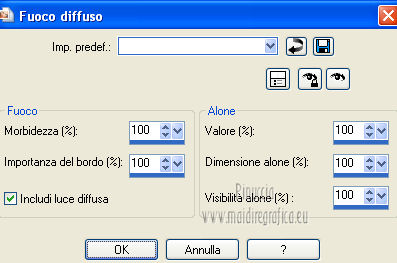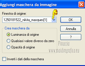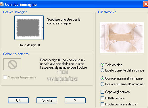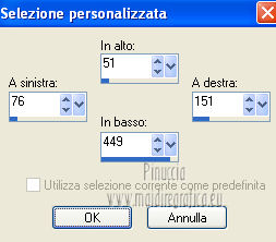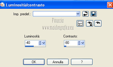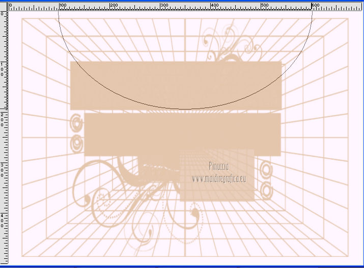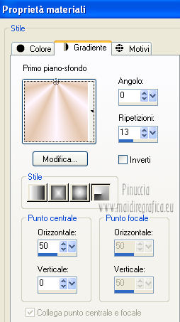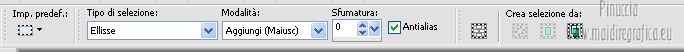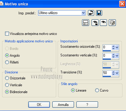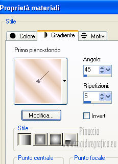 qui puoi trovare qualche risposta ai tuoi dubbi. Se l'argomento che ti interessa non è presente, ti prego di segnalarmelo. Questo tutorial è stato scritto con PSP 9. Per tradurlo, ho usato PSP X. Occorrente: Materiale qui I tubes sono di Yoka e MarieL. La maschera è di Nikita. La figura della freccia è di Adriana. (in questa pagina trovi i links ai loro siti). Se vuoi condividere i tubes, per favore rispetta il lavoro degli autori, e lascia intatto il livello del watermark. ![]() Metti la cornice-immagine "Rand design 01" nella cartella cornici-immagine. Apri la maschera in PSP e minimizzala con il resto del materiale. Apri una nuova immagine trasparente 700 x 500 pixels. Imposta il colore di primo piano con #e4c6ad, e il colore di sfondo con #fff6ff. Riempi l'immagine trasparente con il colore di primo piano.Livelli>Nuovo livello raster. Riempi con il colore di sfondo.Livelli>Nuovo livello maschera>Da immagine. Apri il menu sotto la finestra di origine e vedrai la lista dei files aperti. Seleziona la maschera 1250181522_nikita_masques. ![]() Livelli>Unisci>Unisci gruppo. Passa il colore di primo piano a Gradiente. ![]() Livelli>Nuovo livello raster. Attiva lo strumento Selezione , ellisse![]() Traccia un ellisse partendo dal centro - 350 pixels e tra i punti 100 e 600 pixel ![]() quindi abbassa la forma in basso fino a circa 200 pixels, come nell'esempio. ![]() Riempi la selezione con il gradiente.Regola>Morbidezza>Fuoco diffuso. ![]() Ripeti l'effetto due volte. Regola>Aggiungi/Rimuovi disturbo>Aggiungi disturbo. ![]() Effetti>Effetti di immagine>Motivo unico. ![]() Mantieni selezionato. Riporta il colore di primo piano al colore iniziale. Livelli>Nuovo livello raster. Riempi con il colore di sfondo.Selezione>Modifica>Contrai - 3 pixels. Riempi con il colore di primo piano.Selezione>Modifica>Contrai - 1 pixel. Riempi con il colore di sfondo.Selezione>Modifica>Contrai - 3 pixels. Premi sulla tastiera il tasto CANC. Selezione>Deseleziona. Livelli>Unisci>Unisci giù. Sposta la forma un po' più in alto,in modo che il bordo non sia più visibile. Livelli>Duplica. Immagine>Capovolgi. Effetti>Effetti 3D>Sfalsa ombra, con il colore #755340. ![]() Ripeti l'Effetto Sfalsa ombra, cambiando verticale e orizzontale con -2. Dovresti avere questo. ![]() Passa nuovamente il colore di primo piano a Gradiente, stile Lineare. ![]() Livelli>Nuovo livello raster. Attiva lo strumento Selezione ,clicca sull'icona Selezione personalizzata ![]() e imposta i seguenti settaggi: ![]() Riempi la selezione con il gradiente.Effetti>Effetti di riflesso>Fuga di specchi. ![]() Effetti>Effetti di bordo>Aumenta. Riporta il colore di primo piano al colore iniziale. Livelli>Nuovo livello raster. Riempi con il colore di sfondo.Selezione>Modifica>Contrai - 3 pixels. Riempi con il colore di primo piano.Selezione>Modifica>Contrai - 1 pixel. Riempi con il colore di sfondo.Selezione>Modifica>Contrai - 3 pixels. Premi sulla tastiera il tasto CANC. Selezione>Deseleziona. Livelli>Unisci>Unisci giù. Effetti>Effetti 3D>Sfalsa ombra, con il colore #755340. ![]() Ripeti l'Effetto Sfalsa ombra, cambiando verticale e orizzontale con -2. Abbassa l'opacità di questo livello all'80%. Apri il tube Figure_Arrow2_AdrianaDesigns e vai a Modifica>Copia. Torna al tuo lavoro e vai a Modifica>Incolla come nuovo livello. Sposta la freccia a destra (vedi il mio esempio).Abbassa l'opacità di questo livello al 44%. Apri il tube MarieL_2006_11Novembre e vai a Modifica>Copia. Torna al tuo lavoro e vai a Modifica>Incolla come nuovo livello. Regola>Tonalità e saturazione>Viraggio. ![]() Regola>Luminosità e contrasto>Luminosità e contrasto. ![]() Spostalo un po' più a destra.Cambia la modalità di miscelatura di questo livello in Luce diffusa. Livelli>Duplica. Immagine>Rifletti. ![]() Immagine>Cornice-immagine, seleziona la cornice Rand design 01, con i seguenti settaggi. ![]() Immagine>Aggiungi bordatura, 3 pixels, simmetriche, con il colore #fff6ff. Immagine>Aggiungi bordatura, 1 pixel, simmetriche, con il colore #e4c6ad. Immagine>Aggiungi bordatura, 3 pixels, simmetriche, con il colore #fff6ff. Immagine>Aggiungi bordatura, 35 pixels, simmetriche, con il colore #f7eaee. Selezione>Seleziona tutto. Selezione>Modifica>Contrai - 35 pixels. Selezione>Inverti. Regola>Aggiungi/Rimuovi disturbo>Aggiungi disturbo, con i settaggi precedenti. Selezione>Deseleziona. Apri il tube Yoka-Lady-sitting e vai a Modifica>Copia. Torna al tuo lavoro e vai a Modifica>Incolla come nuovo livello. Immagine>Ridimensiona, una volta al 65% e una volta al 90%, tutti i livelli non selezionato. ![]() Regola>Messa a fuoco>Maschera di contrasto. ![]() Sposta il tube in basso a destra.![]() Effetti>Effetti 3D>Sfalsa ombra, con il colore #755340. ![]() Immagine>Aggiungi bordatura, 3 pixels, simmetriche, con il colore #fff6ff. Immagine>Aggiungi bordatura, 1 pixel, simmetriche, con il colore #e4c6ad. Immagine>Aggiungi bordatura, 3 pixels, simmetriche, con il colore #fff6ff. Aggiungi il tuo nome e/o il tuo watermark su un nuovo livello. Livelli>Unisci>Unisci tutto e salva in formato jpg. ![]() Se hai problemi o dubbi, o trovi un link non funzionante, o anche soltanto per dirmi che ti è piaciuto, scrivimi 14 Gennaio 2013 |