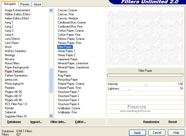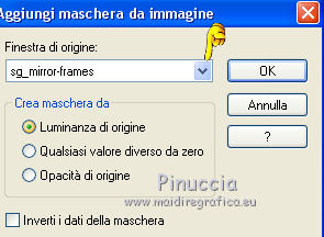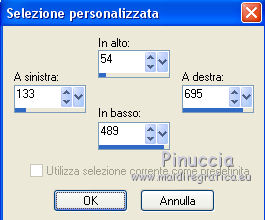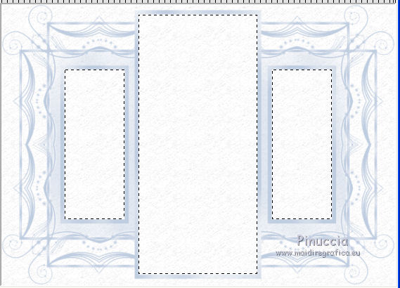 qui puoi trovare qualche risposta ai tuoi dubbi. Se l'argomento che ti interessa non è presente, ti prego di segnalarmelo. Questo tutorial è stato scritto con PSP 9. Per tradurlo, ho usato PSP X. *In memoria di happyholidays. R.I.P." Occorrente: Materiale qui I tubes utilizzati sono di Liza, Jeanne e Brigitte. La maschera è di EssexGirl. (in questa pagina trovi i links ai loro siti). Se vuoi condividere i tubes, per favore rispetta il lavoro degli autori, e lascia intatto il livello del watermark. Filtri: VDL Adrenaline - Snowflakes qui Filters Unlimited 2.0 qui Unplugged Tools qui Animation Shop qui Apri la maschera in PSP e minimizzala con il resto del materiale. Imposta il colore di primo piano con #ffffff, e il colore di sfondo con #bfcde1. Apri una nuova immagine trasparente 700 x 500 pixels, e riempila con il colore di primo piano.Livelli>Duplica. Effetti>Plugins>Filters Unlimited 2.0 - Paper Textures - Filter Paper. ![]() Abbassa l'opacità di questo livello al 44%. Livelli>Nuovo livello raster. Riempi con il colore di sfondo.Livelli>Nuovo livello maschera>Da immagine. Apri il menu sotto la finestra di origine e vedrai la lista dei files aperti. Seleziona la maschera sg_mirror-frames, con i seguenti settaggi. ![]() Livelli>Unisci>Unisci gruppo. Attiva lo strumento Bacchetta magica ![]() ![]() Clicca nei tre rettangoli per selezionarli. ![]() Livelli>Nuovo livello raster. Selezione>Modifica>Espandi - 2 pixels. Apri il tube Backgr 363. Su questo tube: Attiva lo strumento Selezione ![]() clicca sull'icona Selezione personalizzata ![]() e imposta i seguenti settaggi. ![]() Modifica>Copia. Torna al tuo lavoro e vai a Modifica>Incolla nella selezione. Selezione>Deseleziona. Livelli>Disponi>Sposta giù. Abbassa l'opacità di questo livello all'80%. Immagine>Aggiungi bordatura, 1 pixel, simmetriche, con il colore bianco #ffffff. Immagine>Aggiungi bordatura, 45 pixels, simmetriche, con il colore #bfcde1. Immagine>Aggiungi bordatura, 5 pixels, simmetriche, con il colore #ffffff. Seleziona il bordo da 45 pixels con la Bacchetta magica
