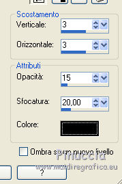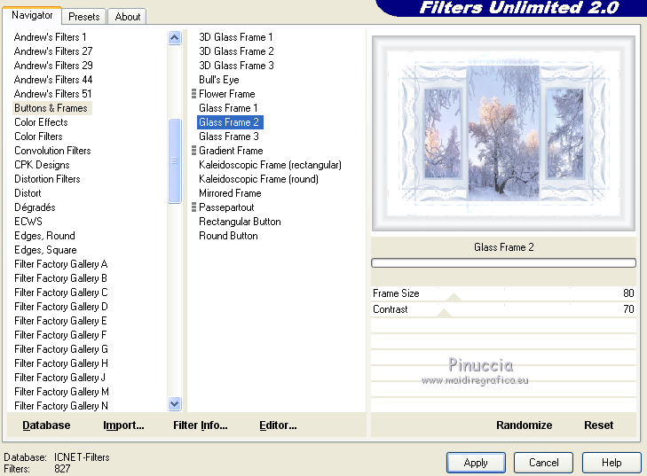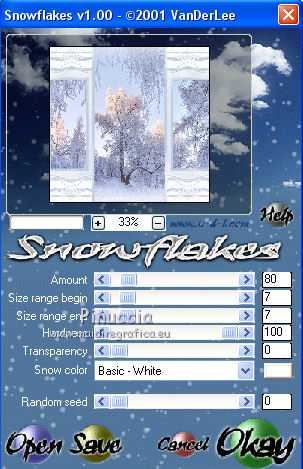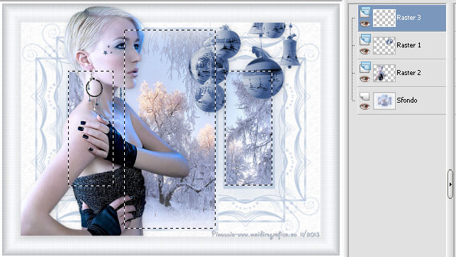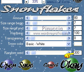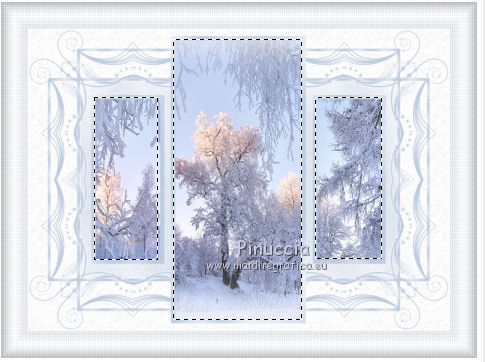 Effetti>Plugins>Unplugged Tools - Spice Dots. ![]() Effetti>Plugins>Filters Unlimited 2.0 - Buttons & Frames - Glass Frame 2. ![]() Selezione>Deseleziona. Apri il tube Mtm_Misc 194 e vai a Modifica>Copia. Torna al tuo lavoro e vai a Modifica>Incolla come nuovo livello. Immagine>Ridimensiona, al 45%, tutti i livelli non selezionato. ![]() Regola>Tonalità e saturazione>Viraggio. ![]() Regola>Luminosità e contrasto>Luminosità e contrasto. ![]() Regola>Messa a fuoco>Maschera di contrasto. ![]() Sposta il tube in alto a destra contro il bordo interno.(vedi l'esempio finale). Effetti>Effetti 3D>Sfalsa ombra. ![]() Apri il tube Liza Lady blue 26-6-2010 e vai a Modifica>Copia. Torna al tuo lavoro e vai a Modifica>Incolla come nuovo livello. Immagine>Ridimensiona, al 70%, tutti i livelli non selezionato. Spostalo nell'angolo in basso a sinistra.Regola>Messa a fuoco>Maschera di contrasto, con i settaggi precedenti. Effetti>Effetti 3D>Sfalsa ombra, con i settaggi precedenti. Firma il tuo lavoro. **Per realizzare l'animazione** Attiva il livello di sfondo. Attiva lo strumento Selezione , rettangolo![]() Seleziona i tre riquadri della maschera. eventualmente, chiudi i livelli superiori per vedere meglio ![]() Riapri i livelli chiusi e rimani posizionato sul livello di sfondo. ![]() Effetti>Plugins>VDL Adrenaline - Snowflakes. ![]() Selezione>Deseleziona. Modifica>Copia Unione. Apri Animation Shop e vai a Modifica>Incolla>Incolla come nuova animazione. Torna in PSP. Modifica>Annulla azione Deseleziona. Modifica>Annulla azione Snowflakes. Effetti>Plugins>VDL Adrenaline - Snowflakes, cambia soltanto Random Seed con 300 e ok. ![]() Selezione>Deseleziona. Torna in Animation Shop e vai a Modifica>Incolla>Incolla dopo il fotogramma corrente. Torna in PSP. Modifica>Annulla azione Deseleziona. Modifica>Annulla azione Snowflakes. Effetti>Plugins>VDL Adrenaline - Snowflakes, cambia soltanto Random Seed con 600 e ok. Selezione>Deseleziona. Torna in Animation Shop e vai a Modifica>Incolla>Incolla dopo il fotogramma corrente. Ancora in PSP. Modifica>Annulla azione Deseleziona. Modifica>Annulla azione Snowflakes. Effetti>Plugins>VDL Adrenaline - Snowflakes, cambia soltanto Random Seed con 900 e ok. Selezione>Deseleziona. Torna in Animation Shop e vai a Modifica>Incolla>Incolla dopo il fotogramma corrente. Ed ecco la tua animazione composta da 4 fotogrammi. Modifica>Seleziona tutto. Animazione>Proprietà fotogramma e imposta la velocità a 20. ![]() Controlla il risultato cliccando su Visualizza e salva in formato gif.![]() Se hai problemi o dubbi, o trovi un link non funzionante, o anche soltanto per dirmi che ti è piaciuto, scrivimi 19 Novembre 2013 |