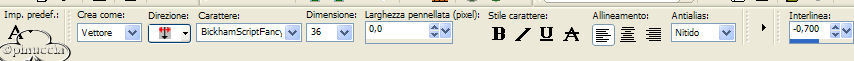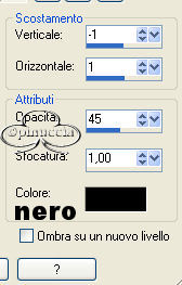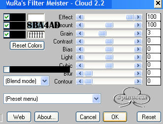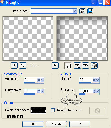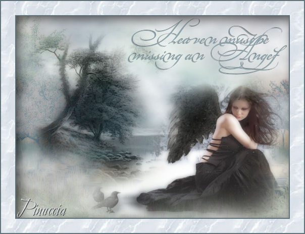 qui puoi trovare qualche risposta ai tuoi dubbi. Se l'argomento che ti interessa non è presente, ti prego di segnalarmelo. Questo tutorial è stato scritto in PSP 9, ma può essere eseguito anche con le altre versioni di PSP. Occorrente: Materiale qui Per favore, se vuoi condividere i tubes, mantieni intatto il livello del nome. Filtri: Mura's Meister qui Xero qui Apri una nuova immagine trasparente 540 x 400 pixels. Imposta il colore di primo piano con #8ba4ad, e il colore di sfondo con il bianco (#ffffff). Effetti>Plugins>Mura's Meister / Cloud, con i settaggi standard: dovresti già trovare impostati nel filtro i colori di primo piano e sfondo, ma a volte non è così, quindi controlla e, se necessario, correggi i colori: ![]() Apri il tube LG_time e vai a Modifica>Copia. Torna al tuo lavoro e vai a Modifica>Incolla>Incolla come nuovo livello. Cambia la modalità di miscelatura di questo livello in Sovrapponi. Apri il tube the-creek e vai a Modifica>Copia. Torna al tuo lavoro e vai a Modifica>Incolla>Incolla come nuovo livello. Spostalo in alto a sinistra.Cambia la modalità di miscelatura in Luminanza (esistente). ![]() Apri il tube PunkyStuff-Blackraven e vai a Modifica>Copia. Torna al tuo lavoro e vai a Modifica>Incolla>Incolla come nuovo livello. Spostalo nell'angolo in basso a destra.Livelli>Unisci>Unisci tutto. Effetti>Plugins>Xero / Porcelain: ![]() Livelli>Nuovo livello raster. Attiva lo strumento Testo ![]() Inverti i colori passando il colore di primo piano a colore di sfondo. Chiudi il livello di primo piano. Io ho usato il font Bickham Script Fancy, vettore, con i seguenti settaggi: ![]() Scrivi il testo: Heaven must be missing an angel. Livelli>Converti in livello raster. Effetti>Effetti 3D>Sfalsa ombra, con i seguenti settaggi, colore nero: ![]() Selezione>Nessuna selezione. Livelli>Unisci>Unisci tutto. Selezione>Seleziona tutto. Livelli>Nuovo livello raster. Effetti>Effetti 3D>Ritaglio, con i seguenti settaggi, colore nero: ![]() Selezione>Nessuna selezione. Imposta il colore di primo piano su #5f727a. Immagine>Aggiungi bordatura, 2 pixels, simmetriche, con il colore bianco. Seleziona il bordo con la bacchetta magica ![]() e riempilo con il colore di primo piano.Selezione>Nessuna selezione. Immagine>Aggiungi bordatura, 30 pixels, simmetriche. Seleziona il bordo con la bacchetta magica ![]() Imposta il colore di sfondo su Motivi: Background blue, angolo 0, scala 100: ![]() e riempi il bordo con questo Motivo.Selezione>Seleziona tutto. Selezione>Modifica>Contrai, di 2 pixels. Selezione>Inverti. Riempi la selezione con il colore di primo piano.Selezione>Nessuna selezione. Livelli>Nuovo livello raster. Aggiungi il tuo nome o il tuo watermark. Livelli>Unisci>Unisci tutto e salva in formato jpg. ![]() Se hai problemi o dubbi, o trovi un link non funzionante, o anche soltanto per dirmi che ti è piaciuto, scrivimi. Ottobre 2006 |