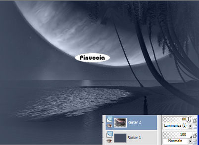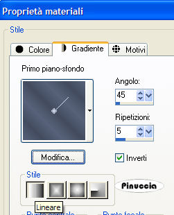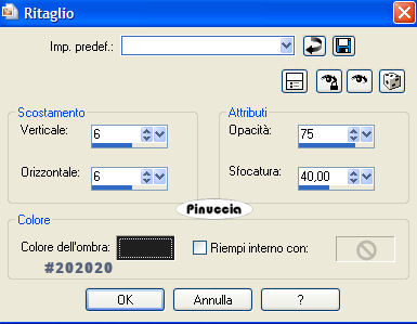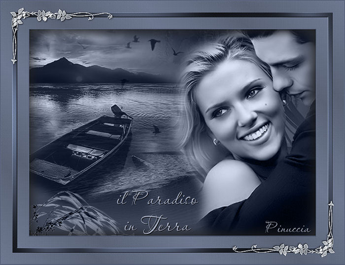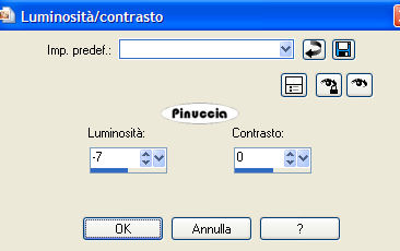 qui puoi trovare qualche risposta ai tuoi dubbi. Se l'argomento che ti interessa non è presente, ti prego di segnalarmelo. Questo tutorial è stato scritto in PSP 9, ma può essere eseguito con qualsiasi versione del programma. Occorrente: Materiale qui I tubes usati per questo tutorial sono di Kara, Marcio, Suzi Sgai, Silke e MarieL. Grazie a tutti per il loro lavoro. Se vuoi condividere i tubes, per favore rispetta il lavoro degli autori, e lascia intatto il livello del watermark. (in questa pagina trovi i links ai siti dei creatori di tubes) Filtri: Graphics Plus qui Penta.com qui Apri una nuova immagine trasparente 625 x 450 pixels. Imposta il colore di primo piano con #434c5f, e il colore di sfondo con #57627a. Riempi l'immagine trasparente con il colore di primo piano.Apri il tube mc2770, e vai a Modifica>Copia. Torna al tuo lavoro e vai a Modifica>Incolla>Incolla come nuovo livello. Attiva lo strumento Deformazione ![]() puntatore se stai usando PSP X,e "tira" l'immagine. ![]() Cambia la modalità di miscelatura di questo livello in Luminanza (esistente) e abbassa l'opacità all'88%. Apri il tube KaraT3157, e vai a Modifica>Copia. Torna al tuo lavoro e vai a Modifica>Incolla>Incolla come nuovo livello. Spostalo in alto a sinistra.Cambia la modalità di miscelatura di questo livello in Luminanza (esistente) e abbassa l'opacità all'80%. Apri il tube SKF_Landscape 223, e vai a Modifica>Copia. Torna al tuo lavoro e vai a Modifica>Incolla>Incolla come nuovo livello. Posizionalo come mostrato nell'esempio sotto.Cambia la modalità di miscelatura di questo livello in Luminanza (esistente), e abbassa l'opacità al 72%. ![]() ![]() Apri il tube SS_1812, e vai a Modifica>Copia. Torna al tuo lavoro e vai a Modifica>Incolla>Incolla come nuovo livello. Immagine>Rifletti. Immagine>Ridimensiona, al 110%, tutti i livelli non selezionato. ![]() Regola>Correzione fotografica>Rimozione disturbo fotocamera digitale. Regola>Luminosità e contrasto>Luminosità e contrasto: ![]() Sposta il tube a destra, un po' in basso.Cambia la modalità di miscelatura di questo livello in Luminanza (esistente). Apri il tube MarieL_2006_11novembre, e vai a Modifica>Copia. Torna al tuo lavoro e vai a Modifica>Incolla>Incolla come nuovo livello. Immagine>Ridimensiona, per due volte al 65%, tutti i livelli non selezionato. Immagine>Rifletti. Spostalo in basso a sinistra.Cambia la modalità di miscelatura di questo livello in Luminanza (esistente). ![]() Livelli>Unisci>Unisci tutto. Immagine>Aggiungi bordatura, 2 pixels, simmetriche, con il colore bianco. Seleziona il bordo con la bacchetta magica .![]() Riempi la selezione con il colore di sfondo.per riempire con il colore di sfondo, devi cliccare con il tasto destro del mouse. Selezione>Nessuna selezione. Passa il colore di primo piano a Gradiente di primo piano/sfondo, con i seguenti settaggi: ![]() Immagine>Aggiungi bordatura, 25 pixels, simmetriche, con il colore bianco. Seleziona il bordo con la bacchetta magica ,e riempilo con il gradiente.Effetti>Plugins>Penta.com - Color Dot, con i settaggi standard. ![]() Selezione>Nessuna selezione. Immagine>Aggiungi bordatura, 10 pixels, simmetriche, con il colore bianco. Seleziona il bordo con la bacchetta magica ,e riempilo con il gradiente.Effetti>Plugins>Graphics Plus - Cross Shadow, con i settaggi standard. ![]() Effetti>effetti 3D>Smusso a rilievo: ![]() Selezione>Nessuna selezione. Immagine>Aggiungi bordatura, 25 pixels, simmetriche, con il colore bianco. Seleziona il bordo con la bacchetta magica ,e riempilo con il gradiente.Effetti>Plugins>Penta.com - Color Dot, con i settaggi standard. ![]() Selezione>Nessuna selezione. Immagine>Aggiungi bordatura, 2 pixels, simmetriche, con il colore bianco. Seleziona il bordo con la bacchetta magica ,e riempilo con il colore di sfondo.Selezione>Seleziona tutto. Selezione>Modifica>Contrai, di 64 pixels. Effetti>Effetti 3D>Ritaglio: ![]() Ripeti l'Effetto ritaglio, ma cambiando verticale e orizzontale a -6. Selezione>Nessuna selezione. Apri il tube "corner zilver 12" e vai a Modifica>Copia. Torna al tuo lavoro e vai a Modifica>Incolla>Incolla come nuovo livello. Spostalo in alto a sinistra.Livelli>Duplica. Immagine>Rifletti. Immagine>Capovolgi. Apri il file con il testo Heaven on earth e vai a Modifica>Copia. Torna al tuo lavoro e vai a Modifica>Incolla>Incolla come nuovo livello. Posiziona il testo come preferisci.Se vuoi, aggungi il tuo nome su un nuovo livello. Liveli>Unisci>Unisci tutto. Salva in formato jpg. ![]() ![]() Se hai problemi o dubbi, o trovi un link non funzionante, o anche soltanto per dirmi che ti è piaciuto, scrivimi ![]() Le mie traduzioni sono regolarmente registrate 29 Giugno 2007 |