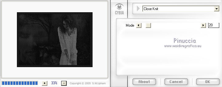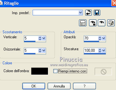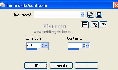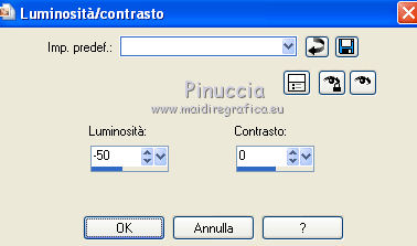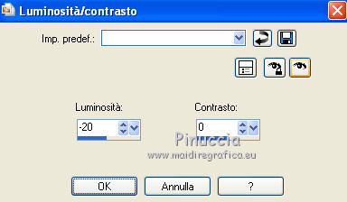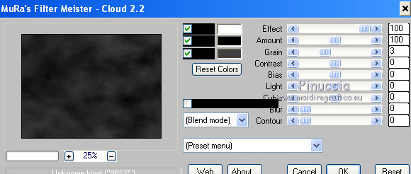 qui puoi trovare qualche risposta ai tuoi dubbi. Se l'argomento che ti interessa non è presente, ti prego di segnalarmelo. Questo tutorial è stato scritto con PSP 9. Per tradurlo, ho usato PSP X. Occorrente: Materiale qui I tubes usati per questo tutorial sono di Yoka, Monique, Farouche, Marion&Dieter, Jet e MarieL. Se vuoi condividere i tubes, per favore rispetta il lavoro degli autori, e lascia intatto il livello del watermark. Filtri: Mura's Meister - Cloud qui Cybia Screenworks qui Filters Unlimited 2.0 qui ![]() Apri una nuova immagine trasparente 700 x 500 pixels. Imposta il colore di primo piano con #000000, e il colore di sfondo con #404040. Riempi l'immagine trasparente con il colore di primo piano.Apri il tube forestdream e vai a Modifica>Copia. Torna al tuo lavoro e vai a Modifica>Incolla come nuovo livello. Regola>Luminosità e contrasto>Luminosità e contrasto. ![]() Spostalo a destra.Cambia la modalità di miscelatura di questo livello in Luminanza (esistente), e abbassa l'opacità al 32%. Apri il tube mds1853 e vai a Modifica>Copia. Torna al tuo lavoro e vai a Modifica>Incolla come nuovo livello. Spostalo in alto a sinistra.Cambia la modalità di miscelatura di questo livello in Luminanza (esistente). Apri il tube Tubes_by_Monique42 e vai a Modifica>Copia. Torna al tuo lavoro e vai a Modifica>Incolla come nuovo livello. Spostalo a sinistra.Cambia la modalità di miscelatura di questo livello in Luminanza (esistente), e abbassa l'opacità al 18%. ![]() Apri il tube mds4747fantasy e vai a Modifica>Copia. Torna al tuo lavoro e vai a Modifica>Incolla come nuovo livello. Regola>Luminosità e contrasto>Luminosità e contrasto. ![]() Spostalo in alto a destra.Cambia la modalità di miscelatura di questo livello in Luminanza (esistente), e abbassa l'opacità al 40%. ![]() Apri il tube MarieL_2006_Novembre e vai a Modifica>Copia. Torna al tuo lavoro e vai a Modifica>Incolla come nuovo livello. Immagine>Ridimensiona, al 70%, tutti i livelli non selezionato. ![]() Regola>Luminosità e contrasto>Luminosità e contrasto. ![]() Sposta il tube in basso a sinistra.Cambia la modalità di miscelatura di questo livello in Luminanza (esistente), e abbassa l'opacità al 30%. Apri il tube jet-nature e vai a Modifica>Copia. Torna al tuo lavoro e vai a Modifica>Incolla come nuovo livello. Immagine>Rifletti. Immagine>Ridimensiona, al 50%, tutti i livelli non selezionato. Cambia la modalità di miscelatura di questo livello in Luminanza (esistente), e abbassa l'opacità al 34%. Posiziona il tube come nel mio esempio.![]() Apri il tube Yoka-Photos-Lady e vai a Modifica>Copia. Torna al tuo lavoro e vai a Modifica>Incolla come nuovo livello. Immagine>Rifletti. Regola>Luminosità e contrasto. ![]() Cambia la modalità di miscelatura di questo livello in Luminanza (esistente), e abbassa l'opacità all'80%. Spostalo a destra e un po' più in basso.Effetti>Effetti 3D>Sfalsa ombra. ![]() Immagine>Aggiungi bordatura, 1 pixel, simmetriche, con il colore nero. Immagine>Aggiungi bordatura, 15 pixels, simmetriche, con #202020. Seleziona questo bordo con la bacchetta magica ![]() ![]() Effetti>Plugins>Cybia - Screenworks. ![]() Selezione>Inverti. Effetti>Effetti 3D>Ritaglio. ![]() Selezione>Deseleziona. Immagine>Aggiungi bordatura, 1 pixel, simmetriche, con il colore nero. Immagine>Aggiungi bordatura, 25 pixels, simmetriche, con il colore bianco. Seleziona questo bordo con la bacchetta magica ![]() Effetti>Plugins>Mura's Meister - Cloud. ![]()
